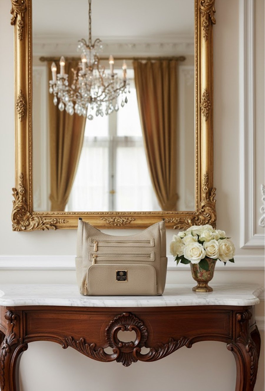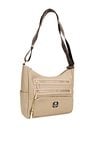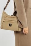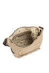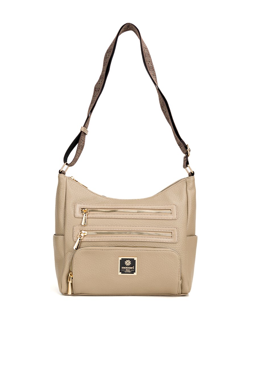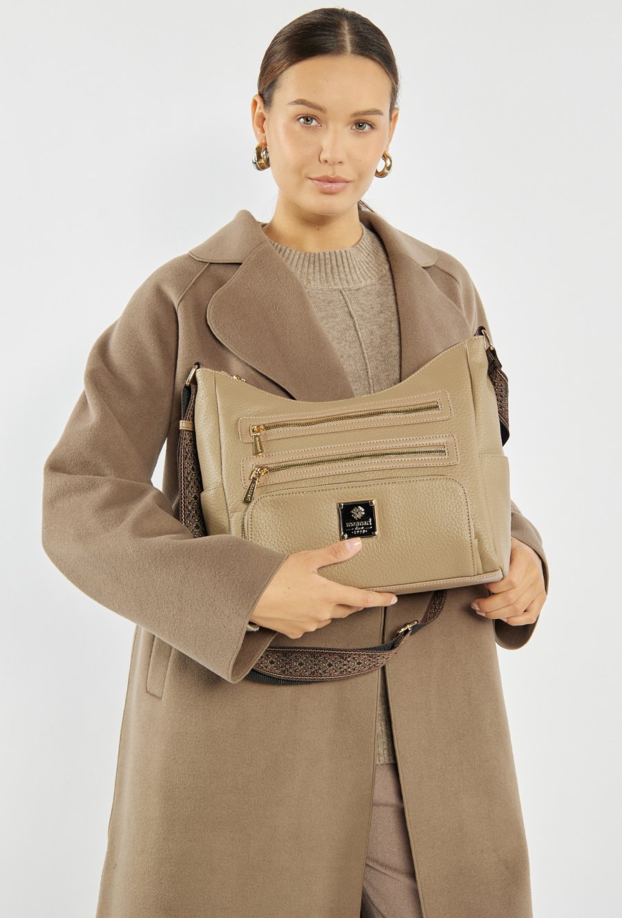 Damska torba z kieszonkami, idealna na co dzień, łączy wygodę użytkowania z ponadczasowym stylem. Jednokomorowe wnętrze zostało wykończone jasną, logowaną podszewką i uzupełnione o praktyczne kieszonki na drobiazgi, które pomagają w codziennej organizacji. Model zawieszony jest na szerokim, materiałowym pasku z możliwością regulacji, co pozwala na komfortowe dopasowanie do sylwetki i preferowanego sposobu noszenia. Torbę należy przechowywać w załączonym woreczku. Wymiary torby: 34 cm x 23 cm x 13 cm.