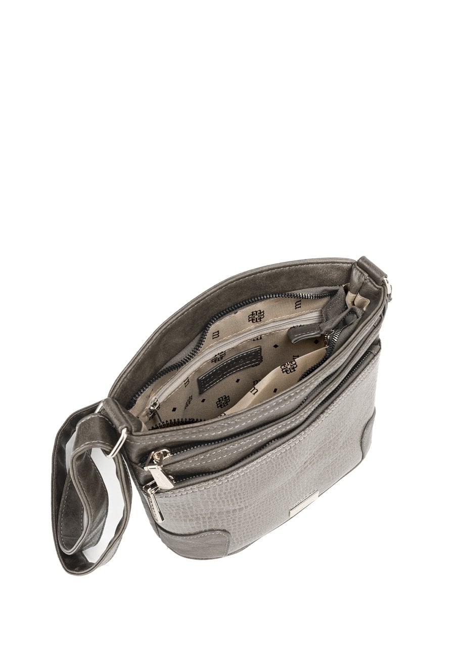Torba damska o wymiarach: 25 cm x 20 cm x 5 cm. Model jednokomorowy z jasnym, logowanym wnętrzem oraz dodatkowymi kieszonkami, idealnymi na drobiazgi. Torba zawieszona na regulowanym pasku, z przodu ozdobiona subtelnym wzorem. Praktycznym uzupełnieniem są dwie kieszonki na przednim panelu, zapinane na suwak. Torbę należy przechowywać w dołączonym woreczku.