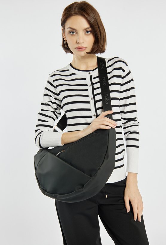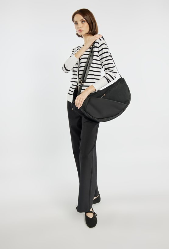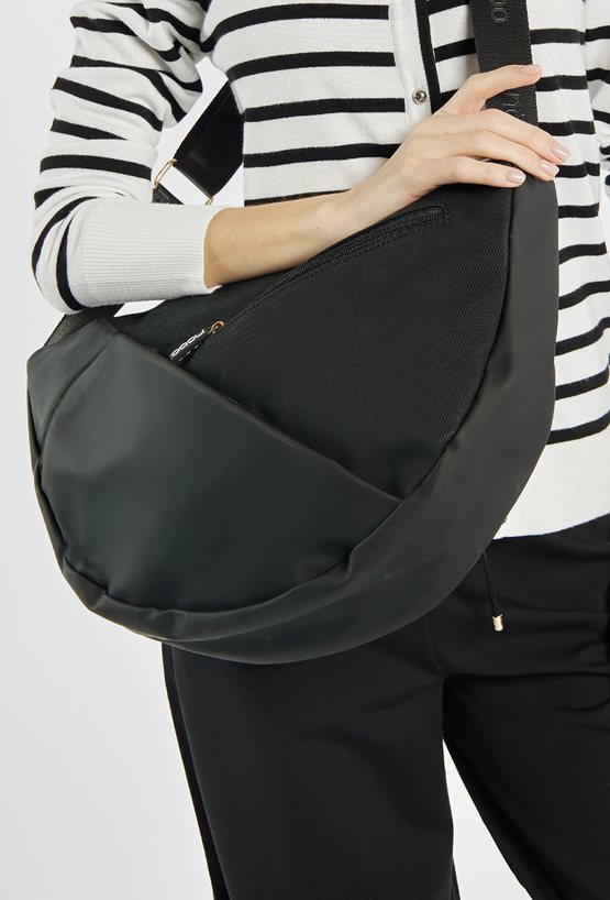 Torba damska typu crossbody z asymetrycznymi kieszonkami, które nadają jej nowoczesnego charakteru. Torebka jednokomorowa z jasną, logowaną podszewką oraz dodatkowymi kieszonkami na drobiazgi. Torba zawieszona na wzorzystym, regulowanym pasku, idealna do codziennych stylizacji. Wymiary: 42,5 cm x 30 cm x 6 cm.