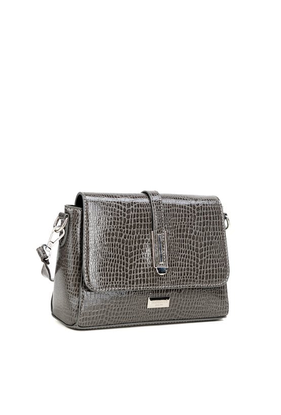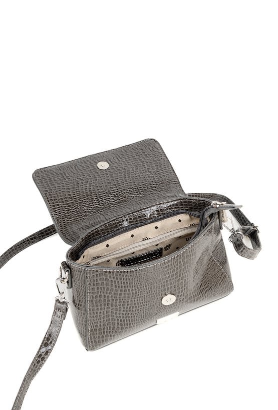 Torebka damska o wymiarach 22 × 16 × 7 cm. Model jednokomorowy z jasną, logowaną podszewką oraz dodatkowymi kieszonkami na drobiazgi. Wyposażona w regulowany pasek z możliwością odpięcia. Torbę należy przechowywać w załączonym woreczku.