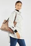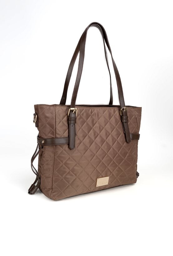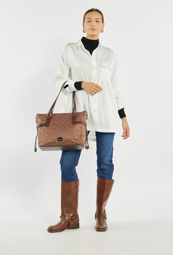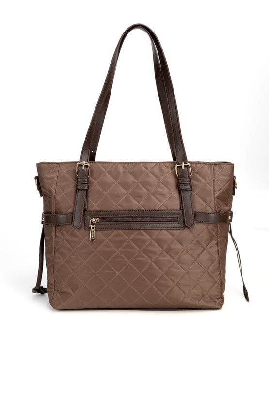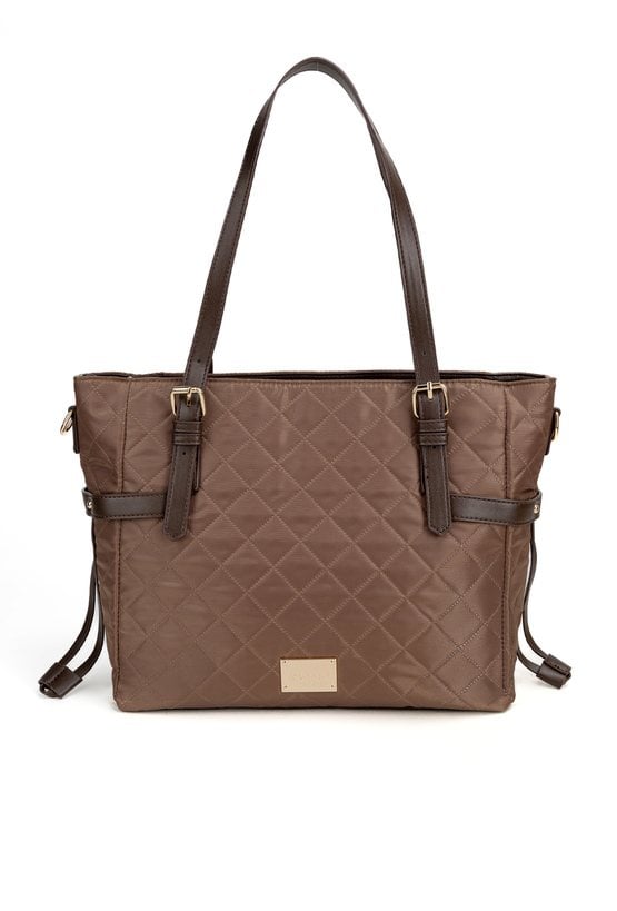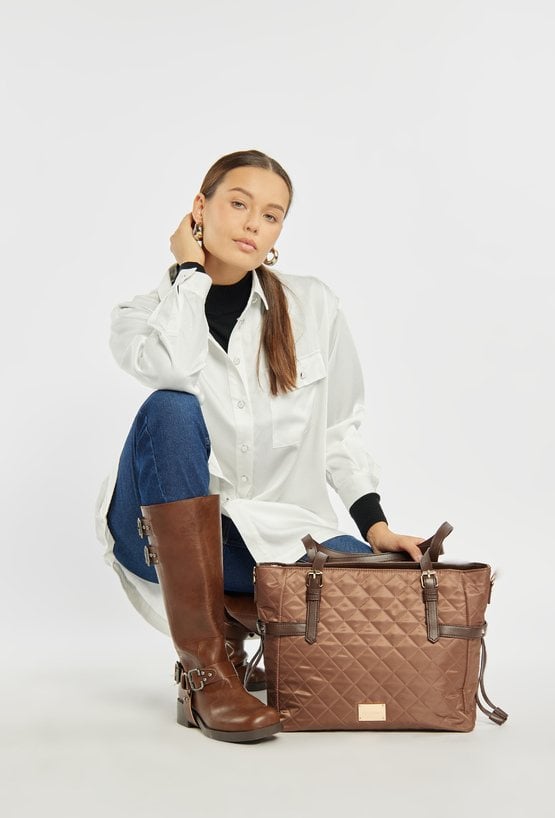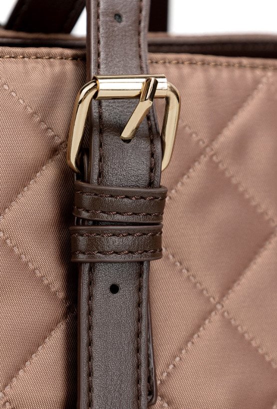 Stylowa torba damska o wymiarach 40 × 29 × 13 cm, wykonana z pikowanego materiału, który nadaje jej elegancki i nowoczesny charakter. Model jednokomorowy, z jasną, logowaną podszewką oraz praktycznymi kieszonkami na drobne akcesoria. Torba wyposażona jest w regulowane rączki, umożliwiające noszenie jej na różne sposoby, a także w odpinany pasek, który dodaje funkcjonalności i wygody. Całość zapinana na zamek błyskawiczny. Torbę należy przechowywać w załączonym woreczku.