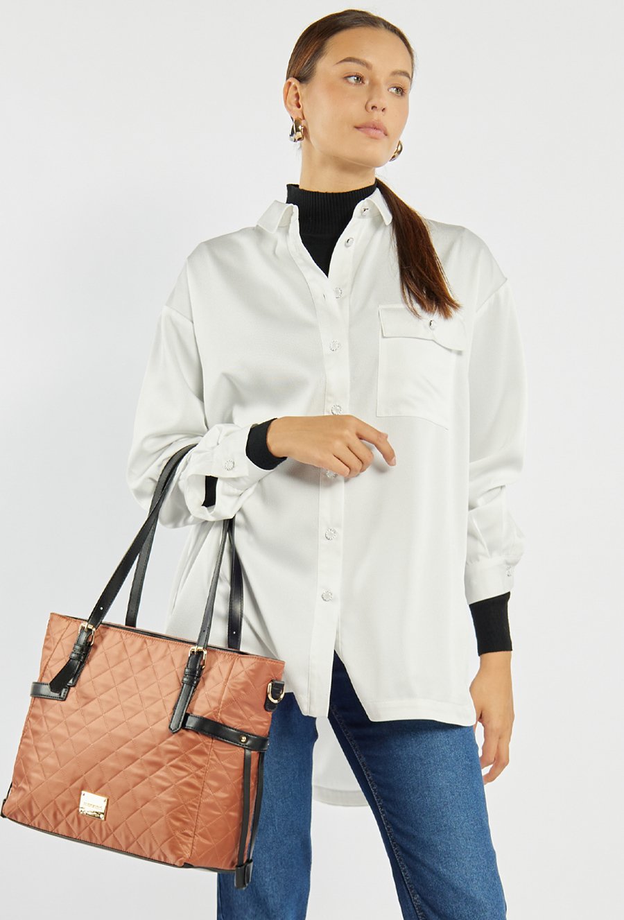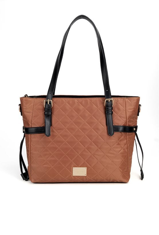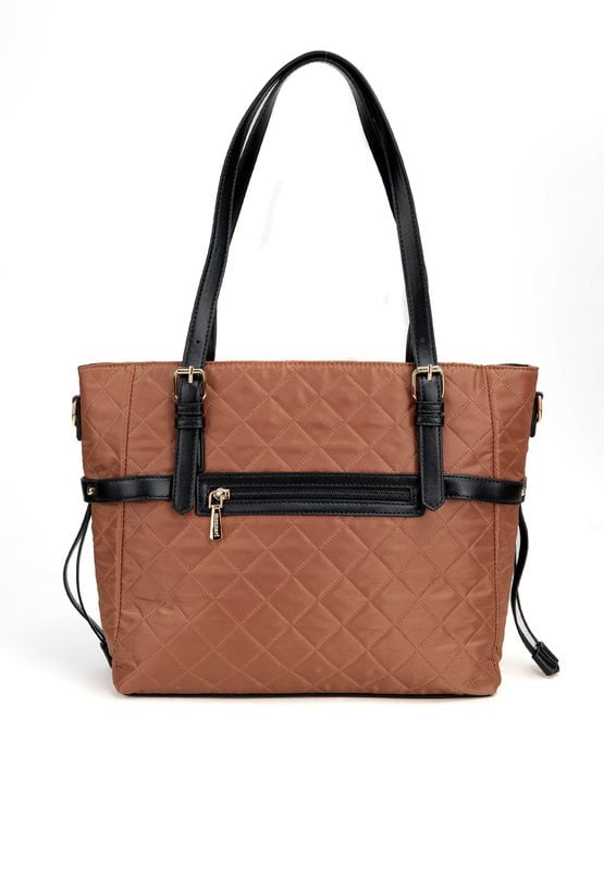 Stylowa torba damska o wymiarach 40 × 29 × 13 cm, wykonana z pikowanego materiału, który nadaje jej elegancki i nowoczesny charakter. Model jednokomorowy, z jasną, logowaną podszewką oraz praktycznymi kieszonkami na drobne akcesoria. Torba wyposażona jest w regulowane rączki, umożliwiające noszenie jej na różne sposoby, a także w odpinany pasek, który dodaje funkcjonalności i wygody. Całość zapinana na zamek błyskawiczny. Torbę należy przechowywać w załączonym woreczku.