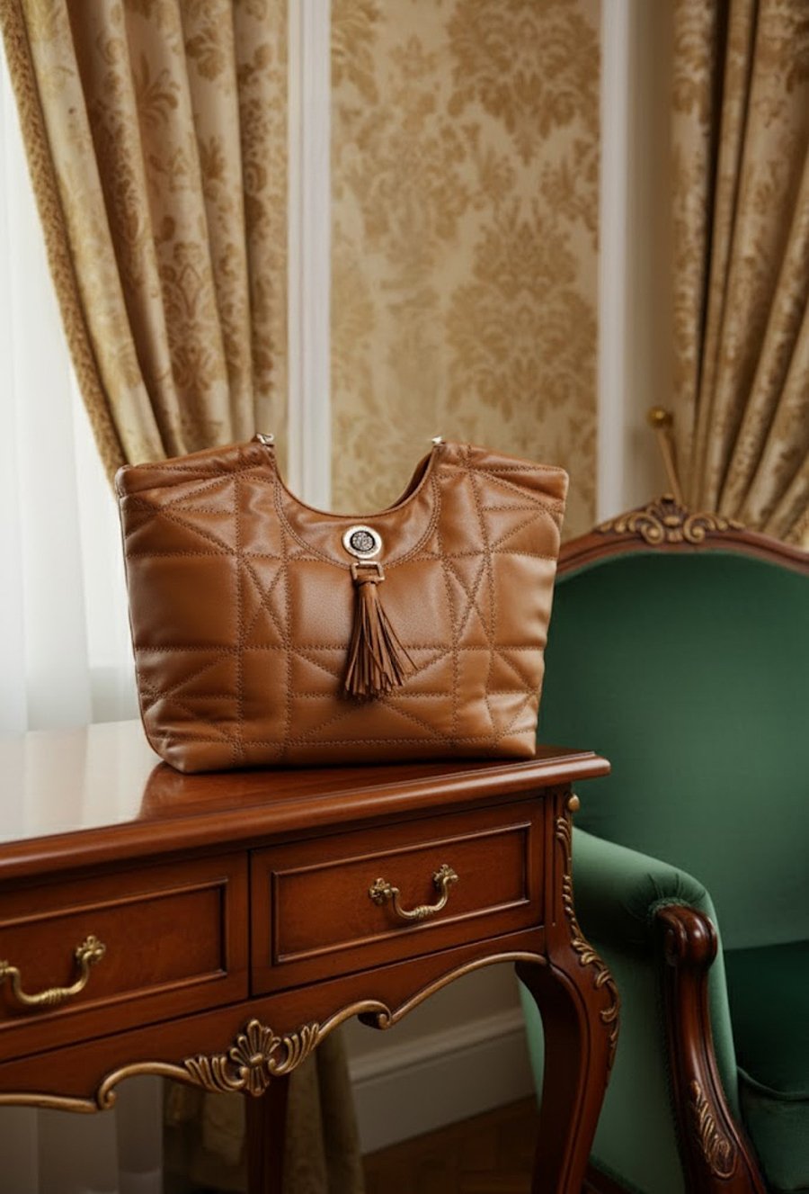 Torba damska z pikowaniem i ozdobnymi frędzlami z przodu. Jednokomorowy model z jasną, logowaną podszewką oraz praktycznymi kieszonkami na drobiazgi. Torba zapinana na napy, zawieszona na rączkach z dekoracyjnym elementem w formie łańcuszka. Torbę należy przechowywać w załączonym woreczku ochronnym. Wymiary: 41 cm x 24 cm x 14 cm