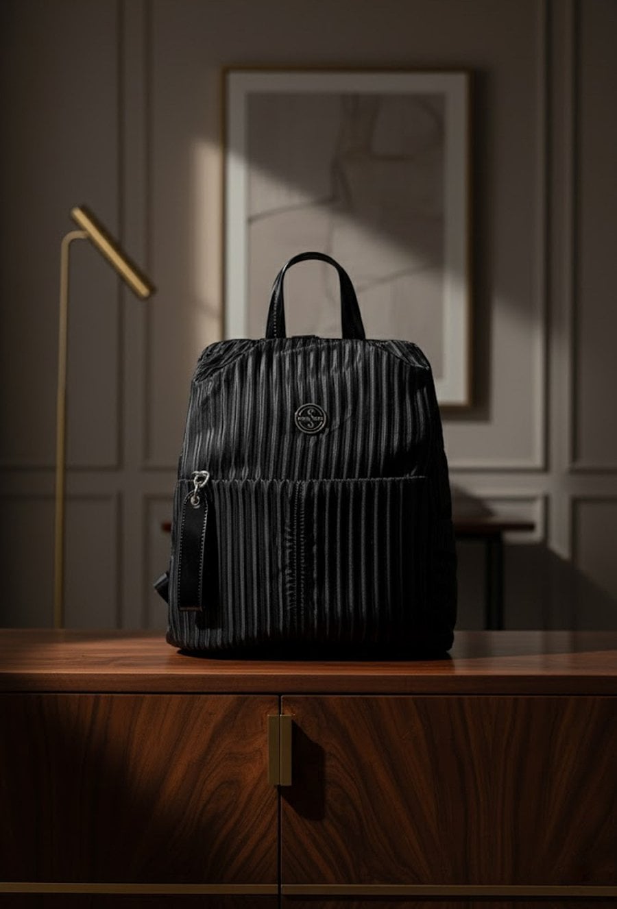 Damski plecak tekstylny o wymiarach 26 cm x 34 cm x 9 cm, łączący funkcjonalność z prostym, nowoczesnym stylem. Plecak jednokomorowy, z główną komorą umieszczoną na plecach, co zapewnia bezpieczeństwo przechowywanych rzeczy. Plecak zawieszony jest na praktycznej rączce oraz regulowanych paskach, umożliwiających komfortowe dopasowanie do indywidualnych potrzeb. Plecak należy przechowywać w dołączonym woreczku.