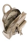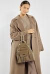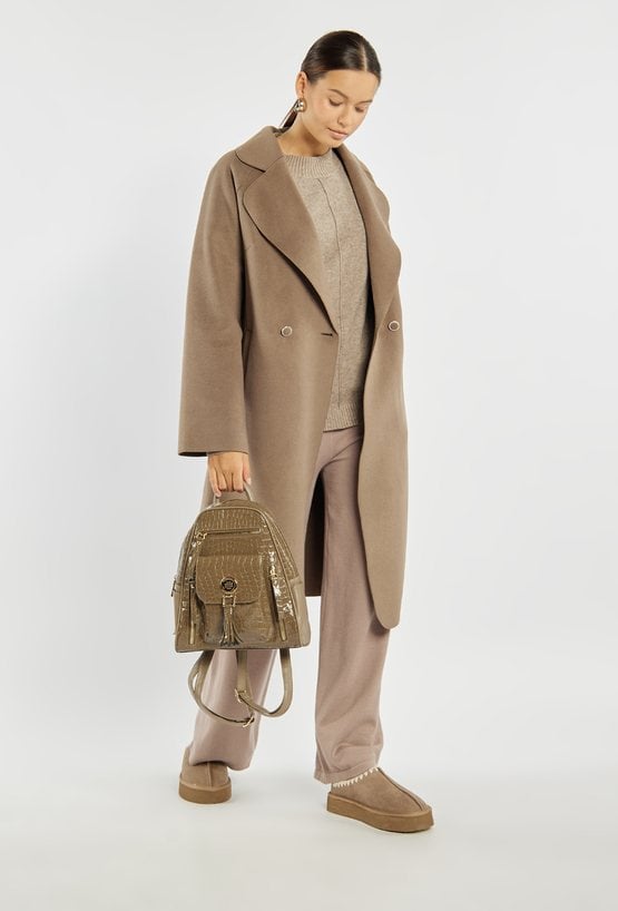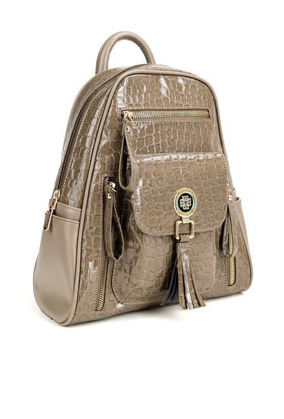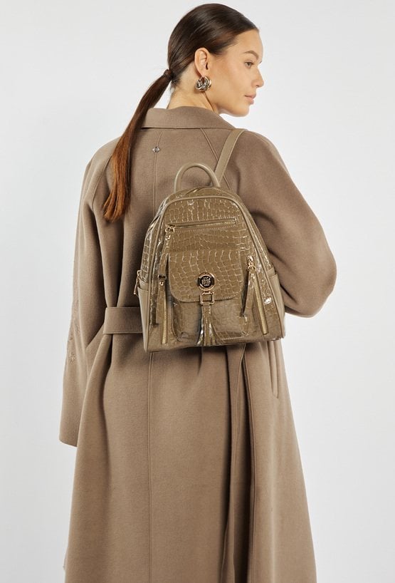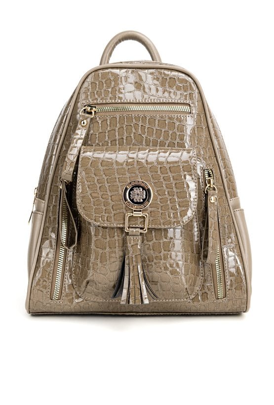 Plecak damski z kolekcji Premium o wymiarach 21 × 30 × 7 cm to połączenie elegancji i funkcjonalności. Jednokomorowe wnętrze wykończone jasną, logowaną podszewką zawiera dodatkowe kieszonki na drobiazgi, które ułatwiają organizację. Na froncie plecaka znajdują się praktyczne kieszonki, z których centralna zamykana jest na klapę z napą i ozdobiona efektownymi frędzlami. Należy przechowywać w dołączonym woreczku.