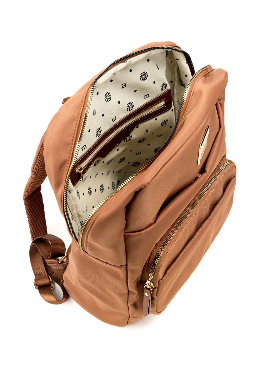 Tekstylny plecak damski o wymiarach 30 × 36,5 × 11 cm. Plecak jednokomorowy z jasną, logowaną podszewką oraz dodatkowymi kieszonkami na drobiazgi. Plecak zawieszony na wygodnej rączce i regulowanych paskach, co zapewnia komfort noszenia. Należy przechowywać w dołączonym woreczku.