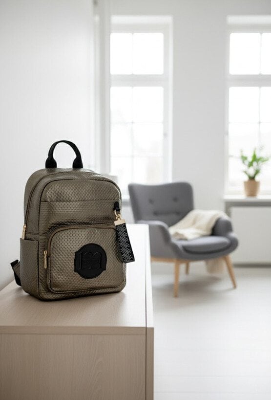 Wodoodporny plecak damski z ozdobną tasiemką na przednim panelu, jednokomorowy, z jasną logowaną podszewką i dodatkowymi kieszonkami wewnątrz, wyposażony w dwie kieszonki z przodu oraz praktyczne kieszenie boczne, łączący funkcjonalność z nowoczesnym designem. Należy przechowywać w dołączonym woreczku. Wymiary: 23,5 cm x 32 cm x 10 cm.