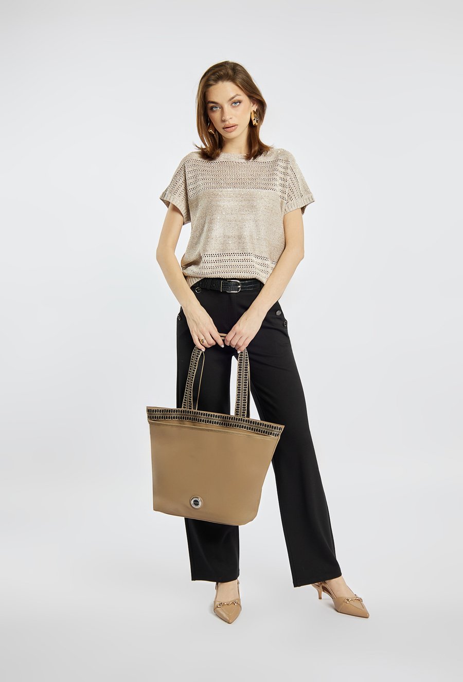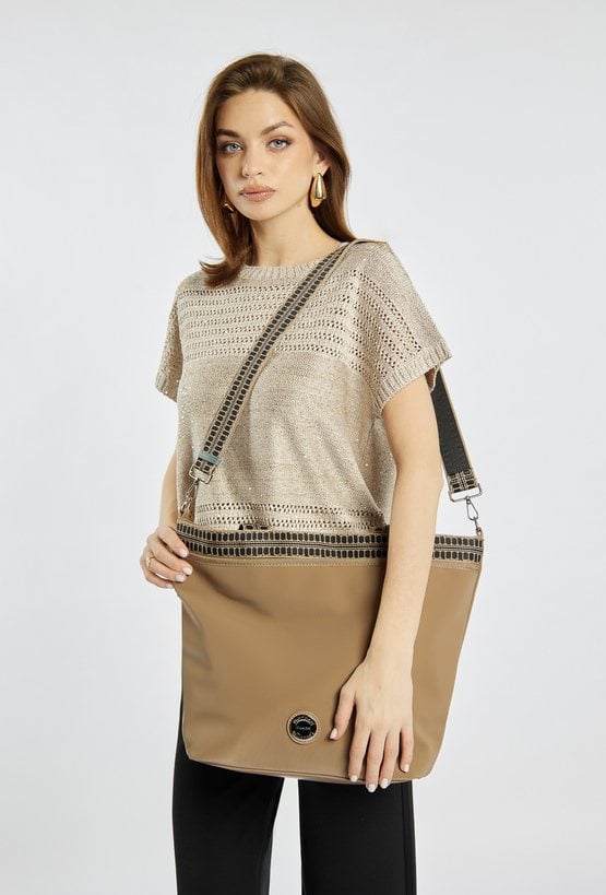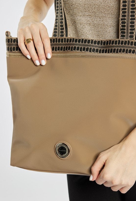 Duża torba damska o wymiarach 42 cm x 33,5 cm x 11 cm, idealna na codzienne wyjścia. Torba zawieszona na raczkach, zapinana na suwak, z dodatkową kieszonką z przodu zamykaną na napę. Jednokomorowa, z jasną, logowaną podszewką. W zestawie znajduje się wzorzysty pasek z regulacją, który pozwala na wygodne noszenie torby na ramieniu.
