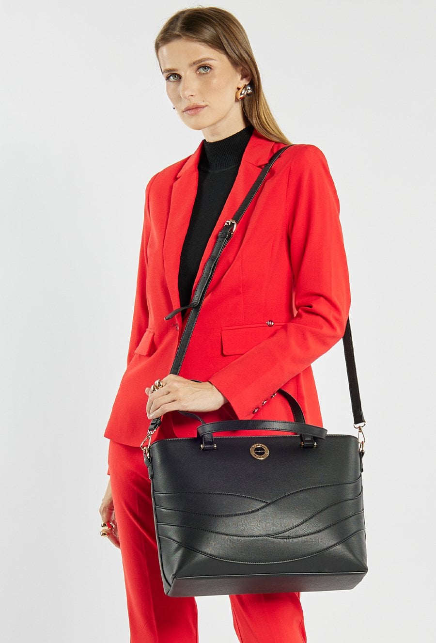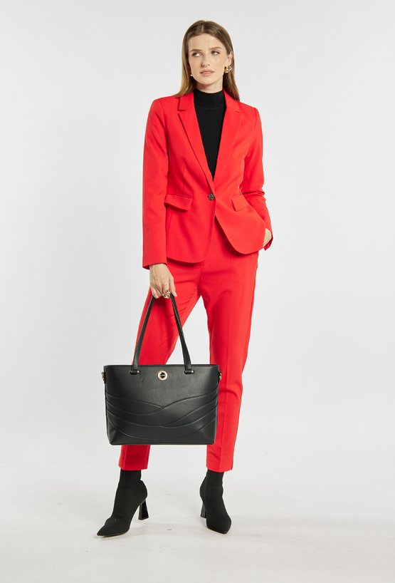 Stylowa torba damska o wymiarach 41 × 27,5 × 11 cm. Model jednokomorowy z jasnym wnętrzem, wyposażony w praktyczne kieszonki na drobiazgi, które ułatwiają organizację. Torba zawieszona na wygodnych rączkach, z dodatkowym regulowanym paskiem w zestawie, umożliwiającym noszenie na ramieniu. Ozdobne, nieregularne przeszycia z przodu w formie fal nadają całości oryginalnego i modowego charakteru. Torbę należy przechowywać w dołączonym woreczku