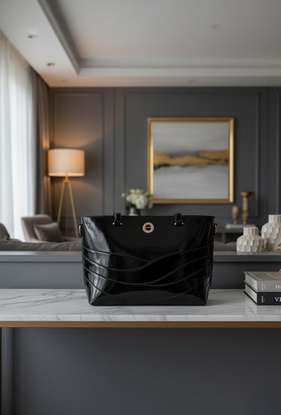Stylowa torba damska o wymiarach 41 × 27,5 × 11 cm. Model jednokomorowy z jasnym wnętrzem, wyposażony w praktyczne kieszonki na drobiazgi, które ułatwiają organizację. Torba zawieszona na wygodnych rączkach, z dodatkowym regulowanym paskiem w zestawie, umożliwiającym noszenie na ramieniu. Ozdobne, nieregularne przeszycia z przodu w formie fal nadają całości oryginalnego i modowego charakteru. Torbę należy przechowywać w dołączonym woreczku