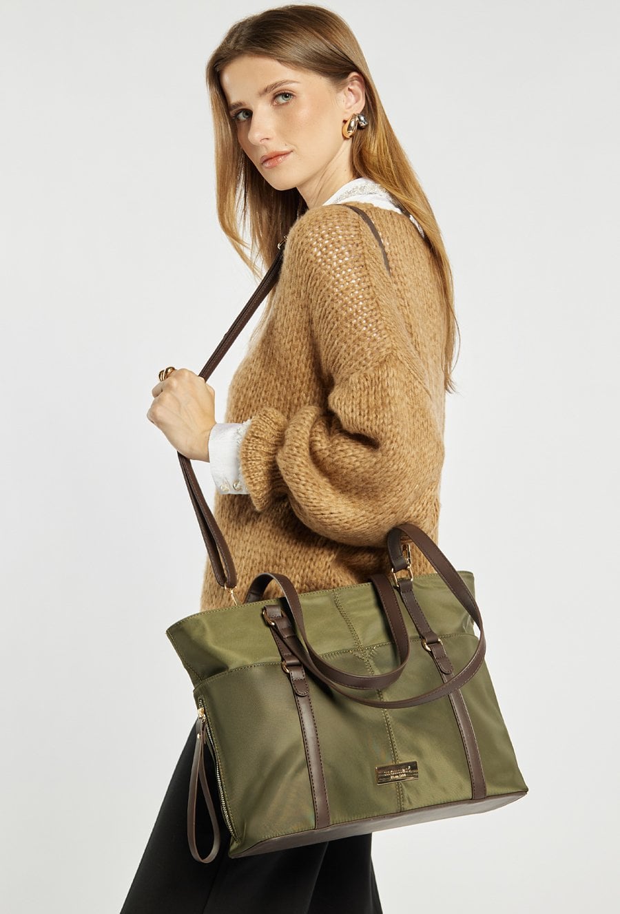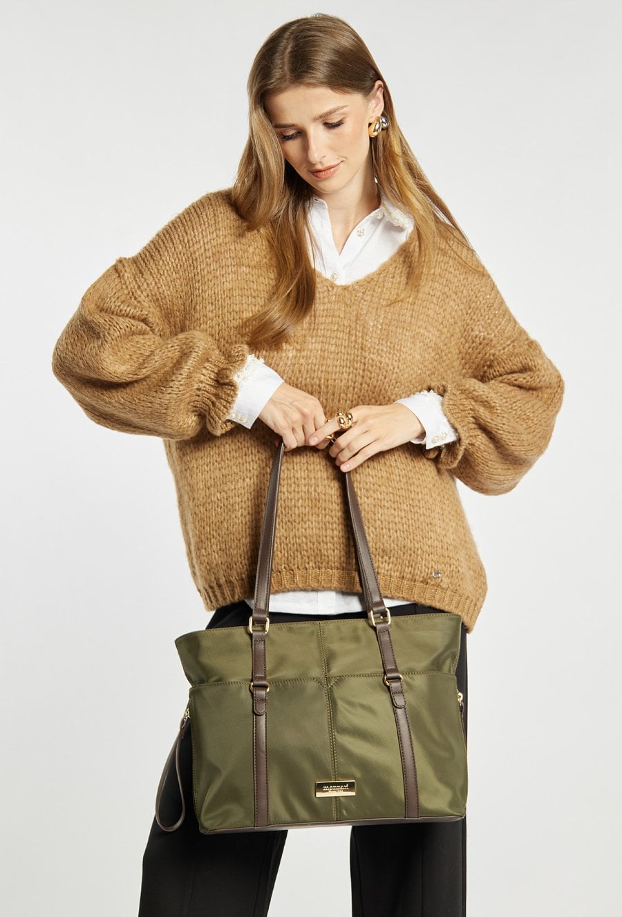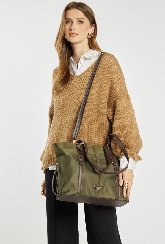 Duża torebka damska o nowoczesnym designie, ozdobiona dekoracyjnymi suwakami, które nadają jej modowego charakteru. Model jednokomorowy, wykończony jasną, logowaną podszewką i wyposażony w dodatkowe kieszonki, ułatwiające organizację niezbędnych drobiazgów. Zawieszona na wygodnych rączkach, z dodatkowym regulowanym paskiem w zestawie – idealna do noszenia na co dzień, zarówno do pracy, jak i w miejskich stylizacjach. Torebkę należy przechowywać w dołączonym woreczku. Wymiary: 42 cm x 29 cm x 14 cm