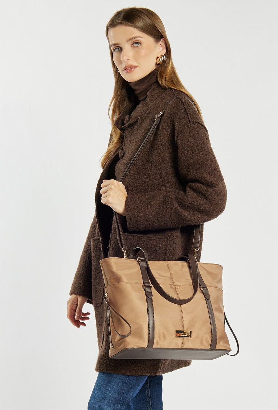 Duża torebka damska o nowoczesnym designie, ozdobiona dekoracyjnymi suwakami, które nadają jej modowego charakteru. Model jednokomorowy, wykończony jasną, logowaną podszewką i wyposażony w dodatkowe kieszonki, ułatwiające organizację niezbędnych drobiazgów. Zawieszona na wygodnych rączkach, z dodatkowym regulowanym paskiem w zestawie – idealna do noszenia na co dzień, zarówno do pracy, jak i w miejskich stylizacjach. Torebkę należy przechowywać w dołączonym woreczku. Wymiary: 42 cm x 29 cm x 14 cm