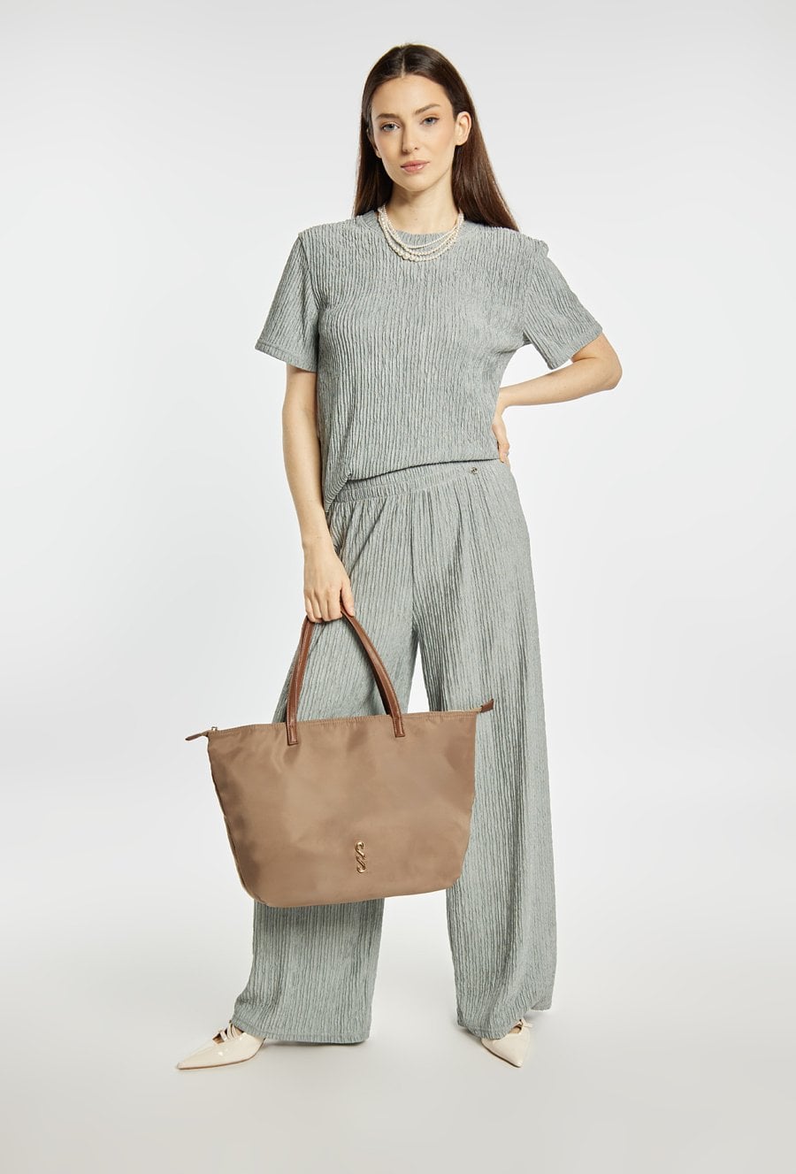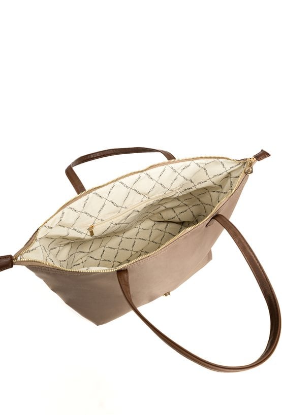 Tekstylna torba damska o wymiarach 45 × 30,5 × 14 cm to pojemny i wygodny wybór na co dzień. Torba jest jednokomorowa, ma jasną, logowaną podszewkę oraz dodatkowe kieszonki na drobiazgi, które ułatwiają organizację wnętrza. Torba zawieszona na rączkach zapewnia komfort noszenia. Torbę należy przechowywać w dołączonym woreczku.