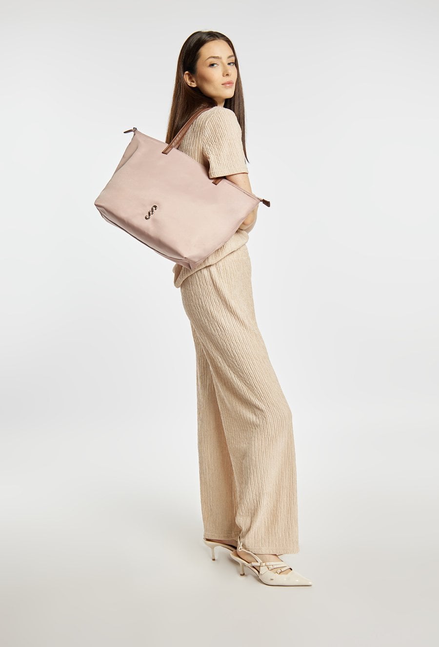 Tekstylna torba damska o wymiarach 45 × 30,5 × 14 cm to pojemny i wygodny wybór na co dzień. Torba jest jednokomorowa, ma jasną, logowaną podszewkę oraz dodatkowe kieszonki na drobiazgi, które ułatwiają organizację wnętrza. Torba zawieszona na rączkach zapewnia komfort noszenia. Torbę należy przechowywać w dołączonym woreczku.