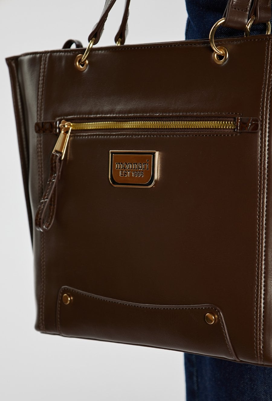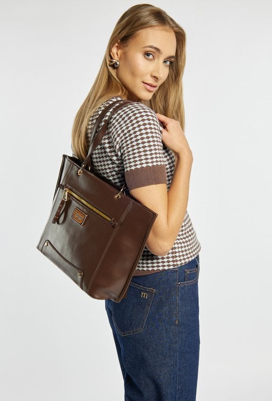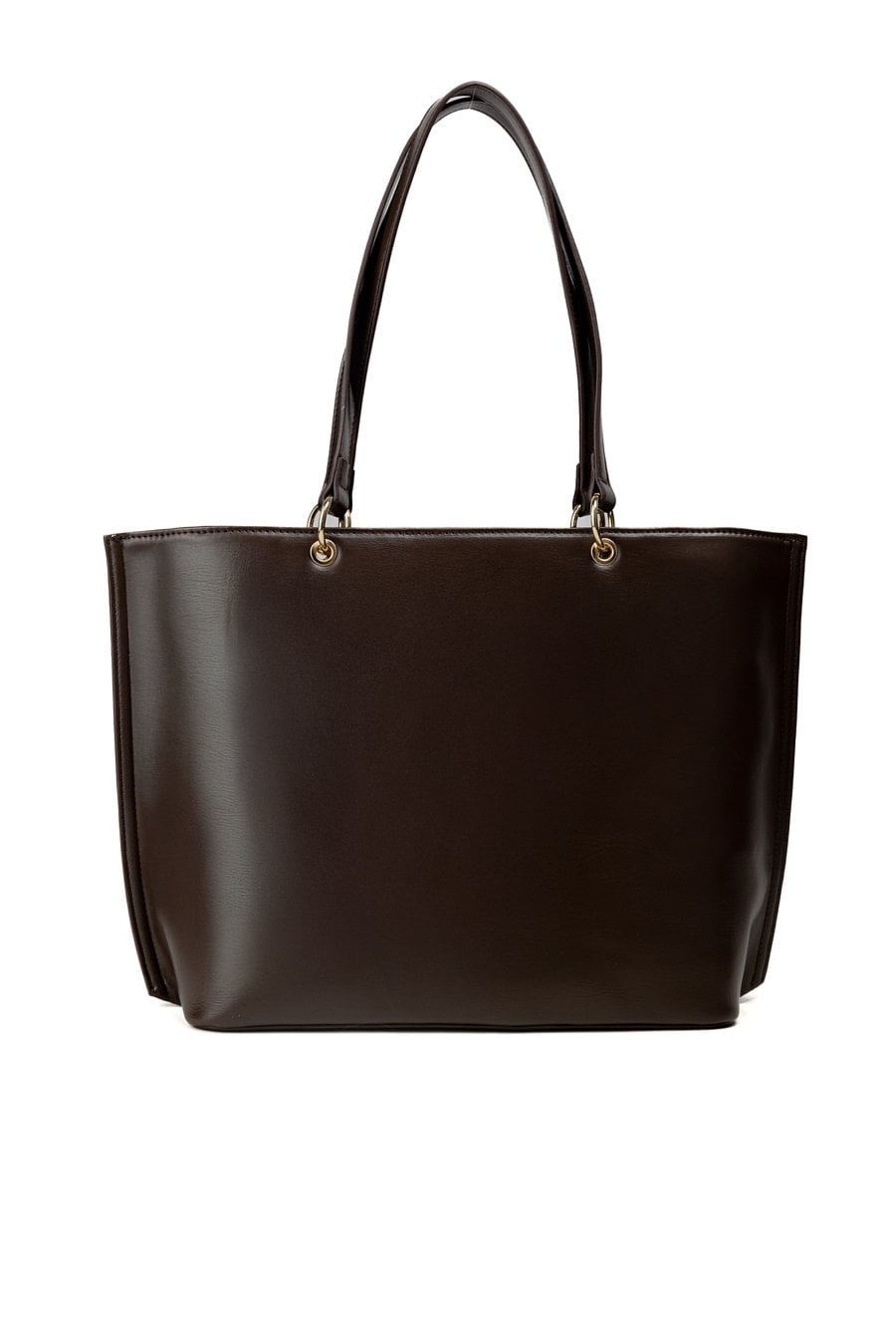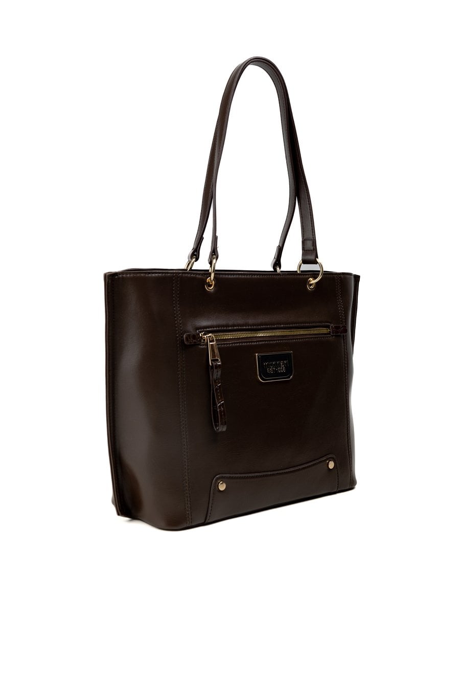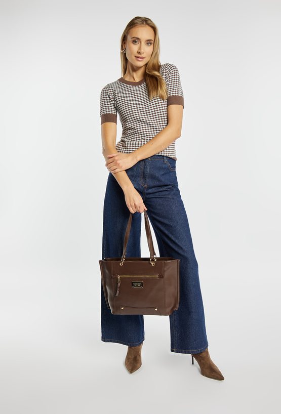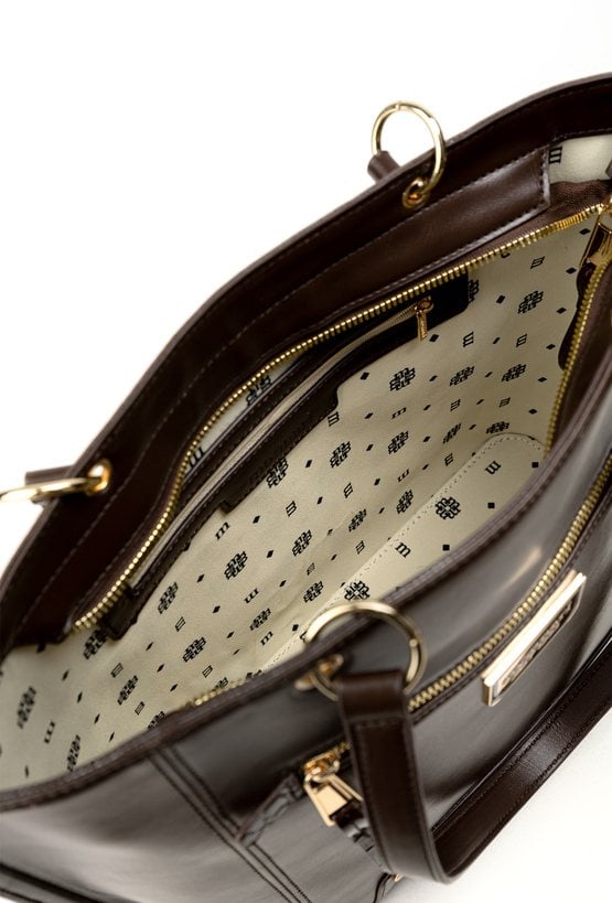 Torba damska typu shopper o wymiarach 41,5 cm x 26 cm x 10 cm. Model jednokomorowy, z jasną, logowaną podszewką oraz dodatkowymi kieszonkami na drobiazgi, które ułatwiają organizację. Zawieszona na rączkach, łączy w sobie elegancję i funkcjonalność. Torbę należy przechowywać w załączonym woreczku ochronnym.
