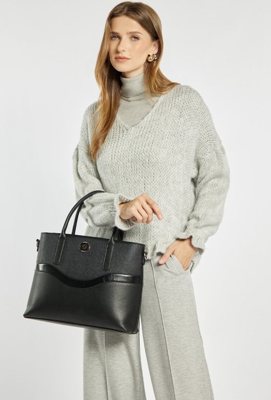 Duża torba damska o wymiarach 39 × 27,5 × 9 cm, doskonała na co dzień i do pracy. Torba jednokomorowa o jasnej logowanej podszewce z dodatkowymi kieszonkami na drobiazgi. Subtelny wzór nadaje całości eleganckiego charakteru. Model zawieszony na rączkach, z dodatkowym regulowanym paskiem w zestawie, który umożliwia noszenie torby także na ramieniu. Torebkę należy przechowywać w dołączonym woreczku.