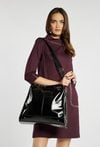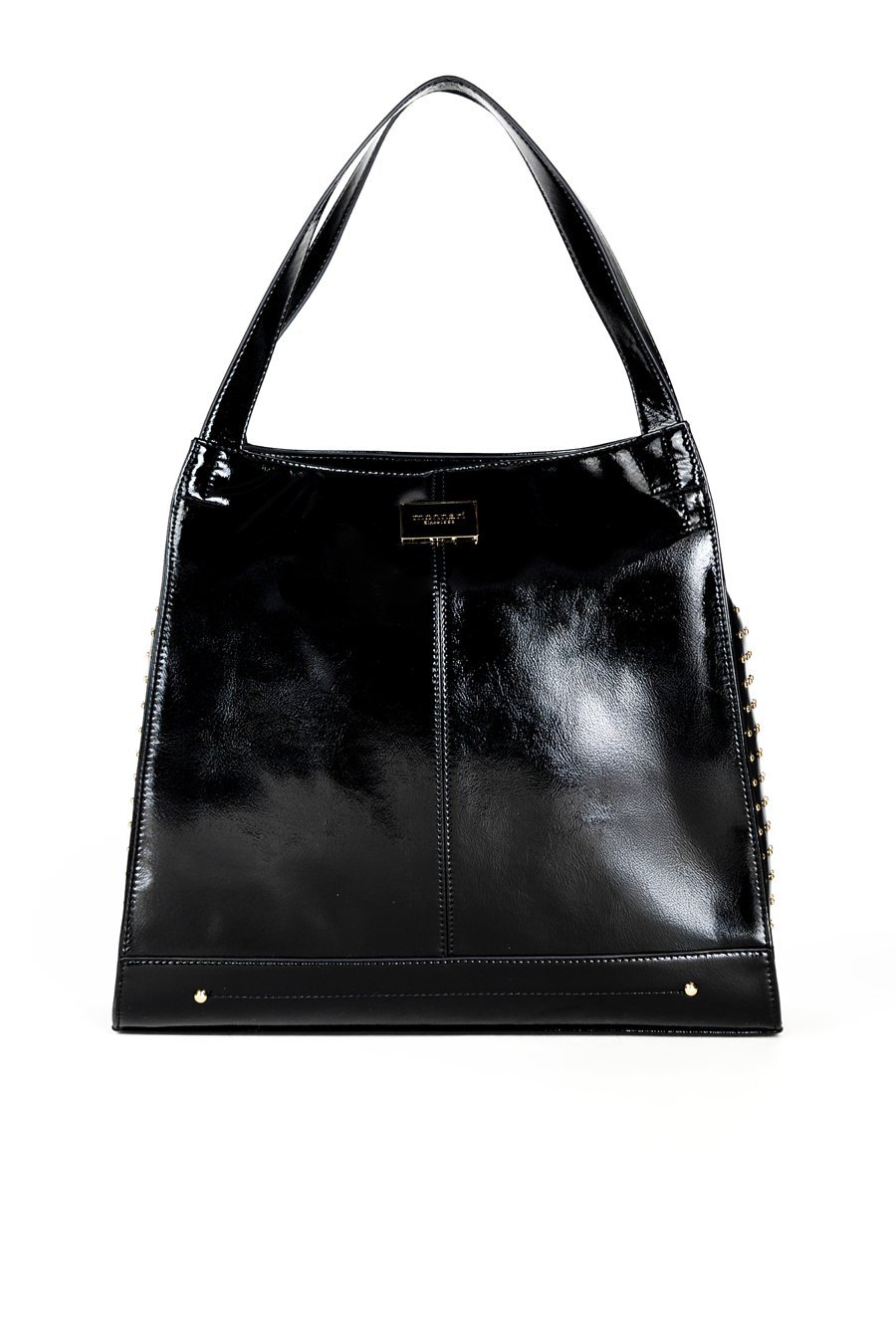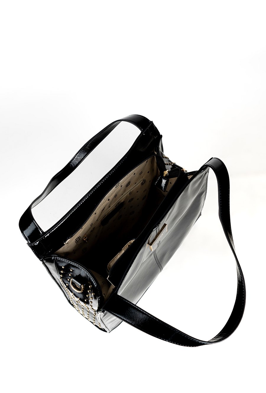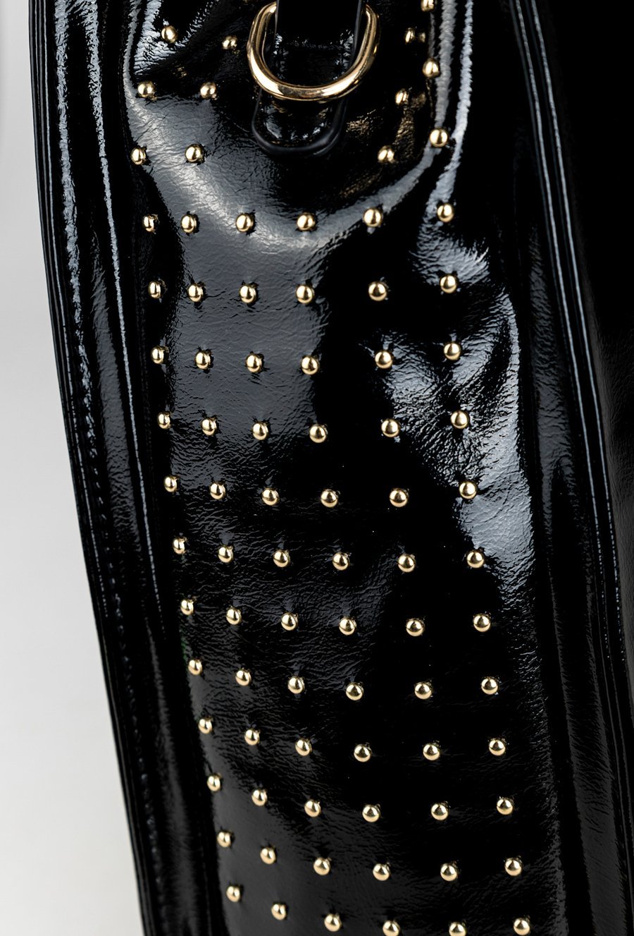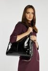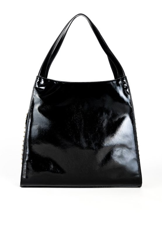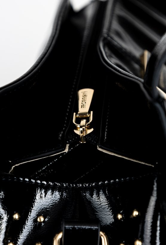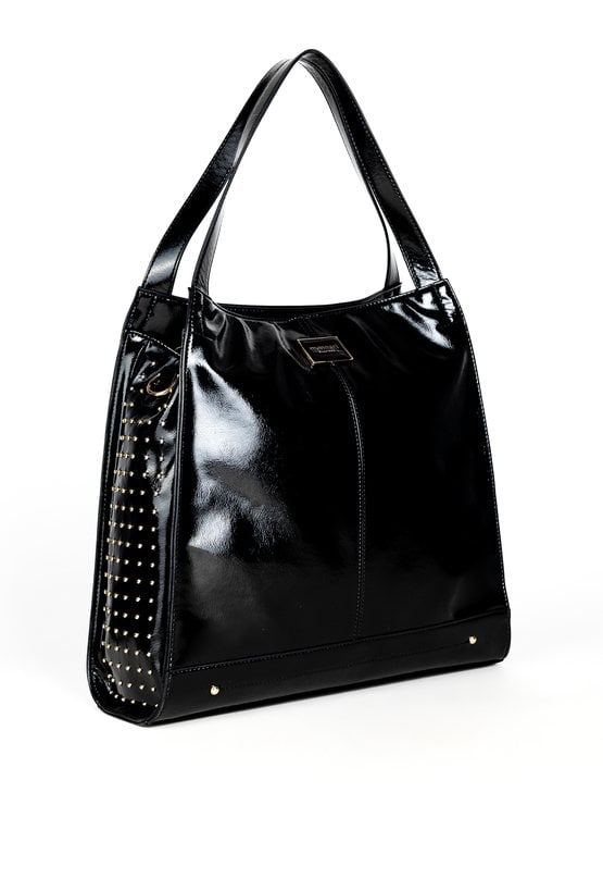 Duża torba damska zapinana na suwak, łącząca praktyczność z modowym akcentem. Jednokomorowe wnętrze wykończone jasną, logowaną podszewką, wyposażone zostało w dodatkowe kieszonki, które ułatwiają organizację codziennych drobiazgów. Model zawieszony na wygodnych rączkach, z dodatkowym regulowanym paskiem w zestawie, umożliwiającym noszenie na ramieniu. Subtelne ćwieki umieszczone po bokach nadają torbie wyrazistego charakteru i nowoczesnego stylu. Torbę należy przechowywać w dołączonym woreczku. Wymiary: 33,5 cm x 35 cm x 12 cm.