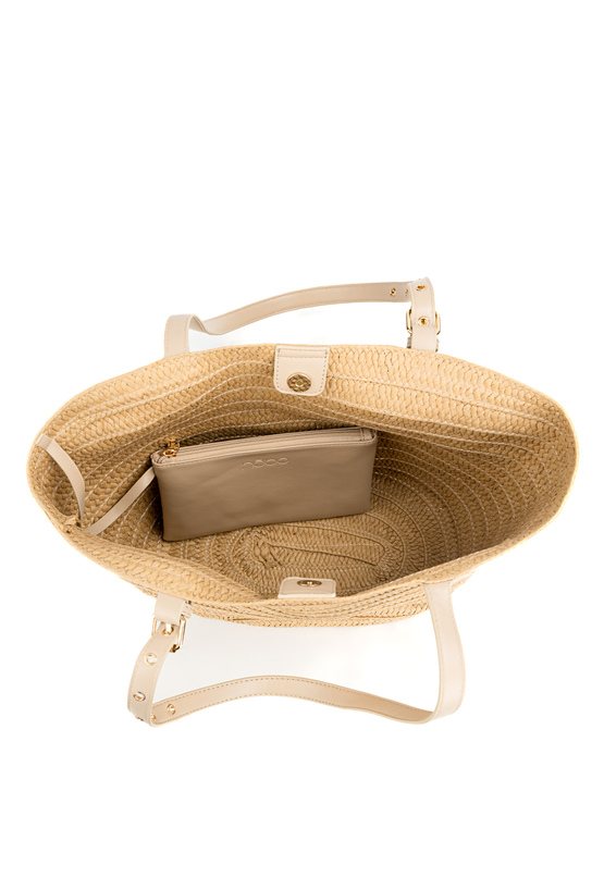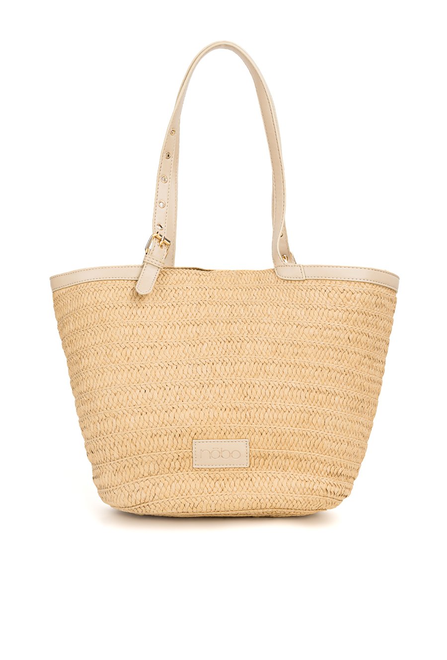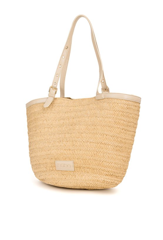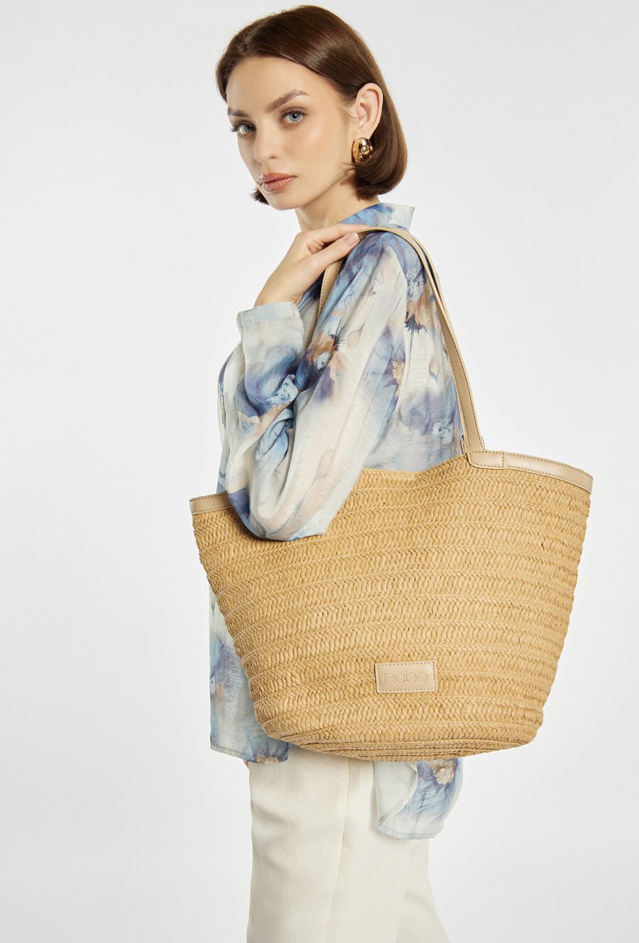 Damska torba typu shopper z plecionką. Jednokomorowy model zapinany na napę, zawieszony na regulowanych rączkach. Dodatkowym atutem jest saszetka zapinana na suwak, idealna na najpotrzebniejsze drobiazgi. Torbę należy przechowywać w dołączonym woreczku. Wymiary: 39 × 30,5 × 12 cm.