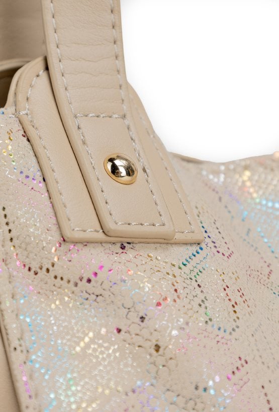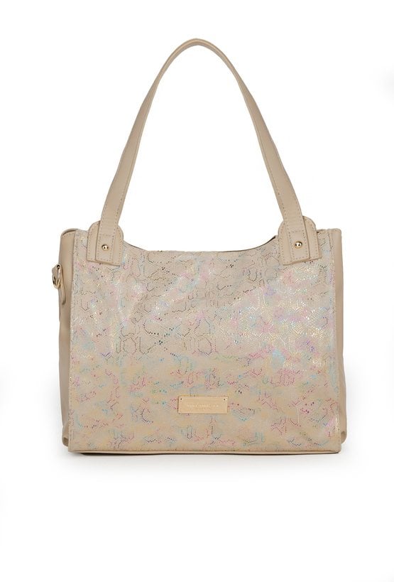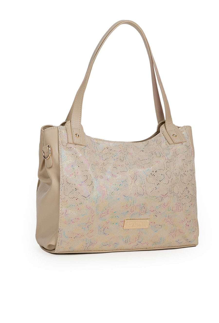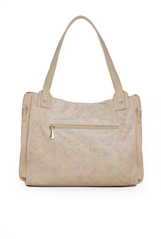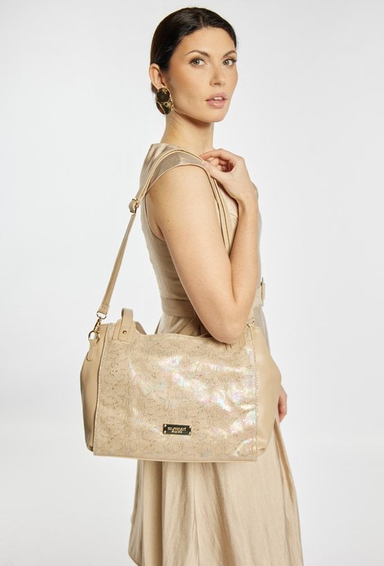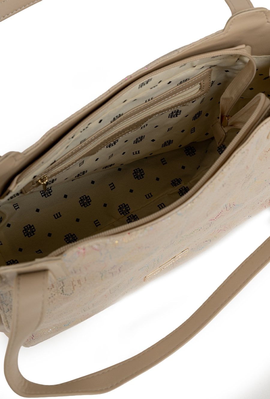 Torba damska typu shopper o wymiarach 41 × 25,5 × 12 cm to pojemny i stylowy model na co dzień. Torba jest jednokomorowa, ma jasną, logowaną podszewkę oraz dodatkowe kieszonki na drobiazgi, które ułatwiają organizację. Torba zawieszona na wygodnych rączkach, w zestawie ma odpinany, regulowany pasek, a całość zdobi modny wzór.