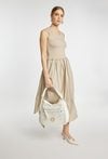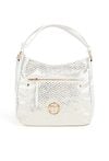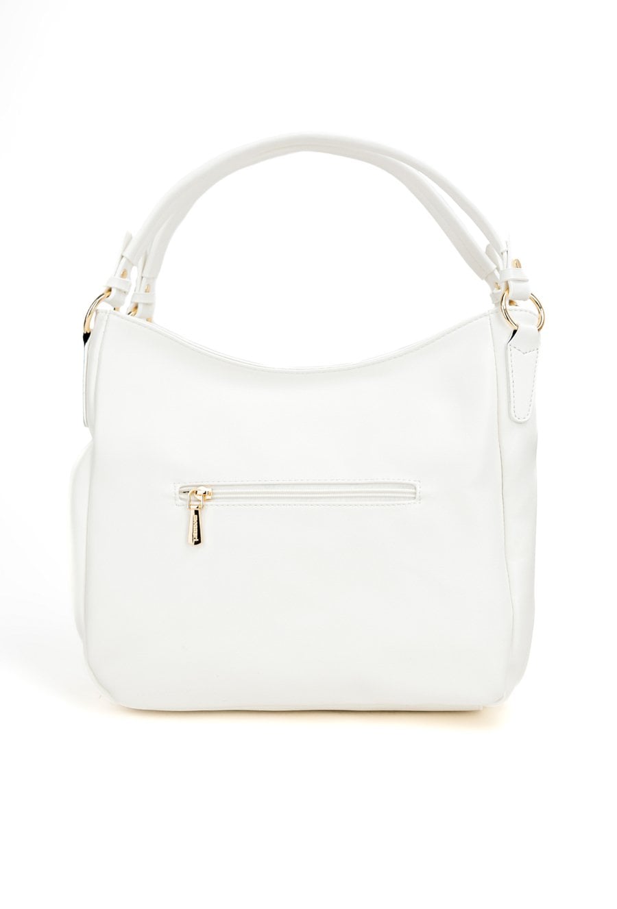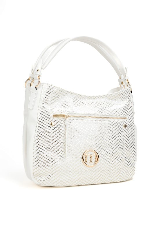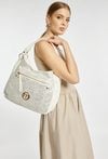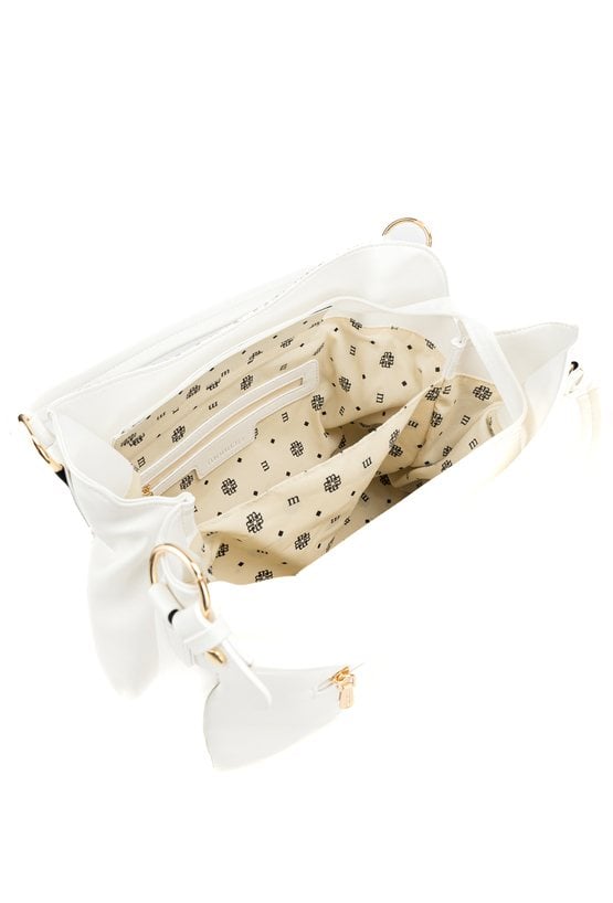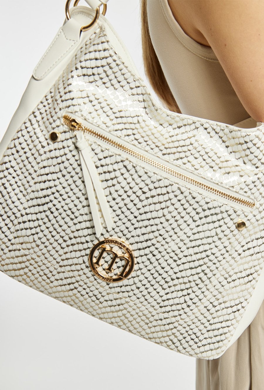 Damska torba typu worek z dekoracyjnym wzorem na przednim panelu. Jednokomorowe wnętrze z jasną, logowaną podszewką wyposażono w dodatkowe kieszonki na drobiazgi. Torba zawieszona na rączkach. Wymiary: 36 × 26 × 14 cm. Torbę należy przechowywać w dołączonym woreczku.