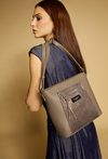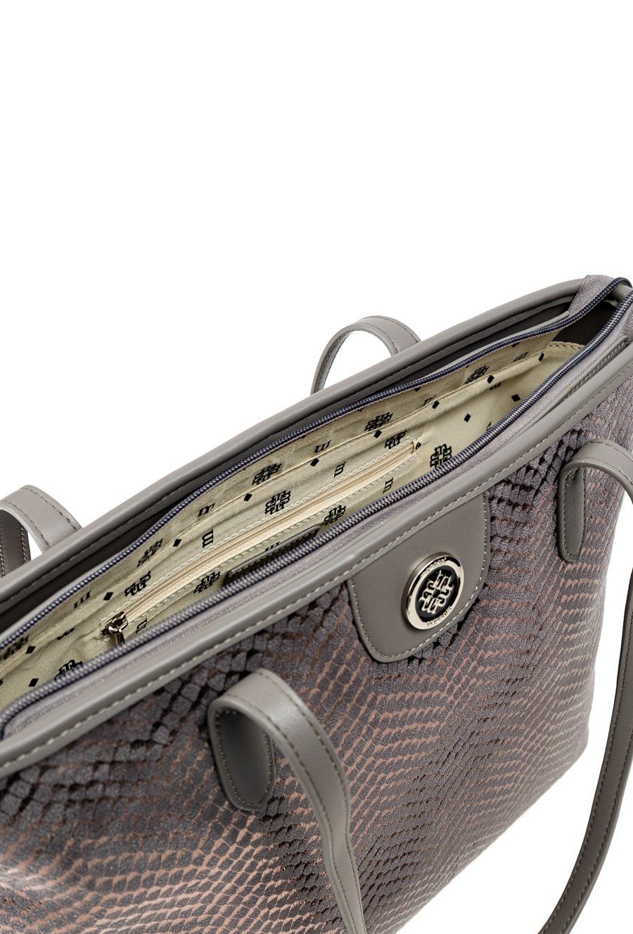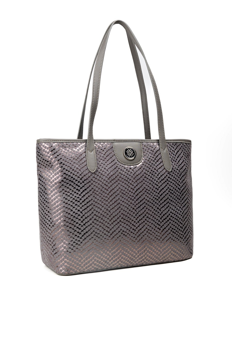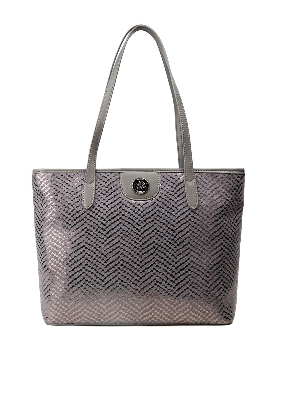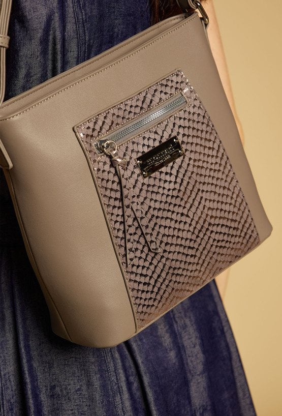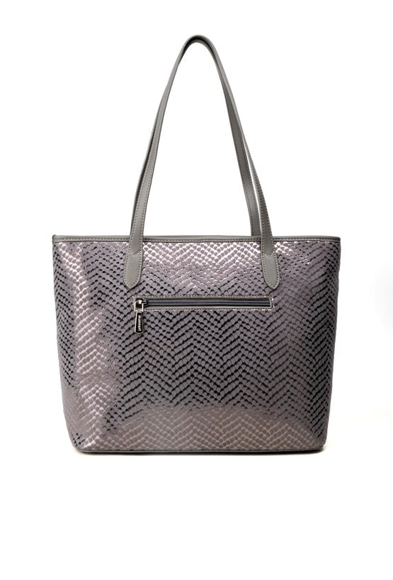 Duża torba damska o wymiarach: 40 cm x 27,5 cm x 12 cm. Torba jednokomorowa o jasnej, logowanej podszewce z dodatkowymi kieszonkami na drobiazgi. Torba zawieszona na rączkach, wygodna i pojemna – idealna na co dzień. Atutem modelu jest efektowny, wzorzysty panel, który nadaje jej wyjątkowego stylu. Torbę należy przechowywać w załączonym woreczku.