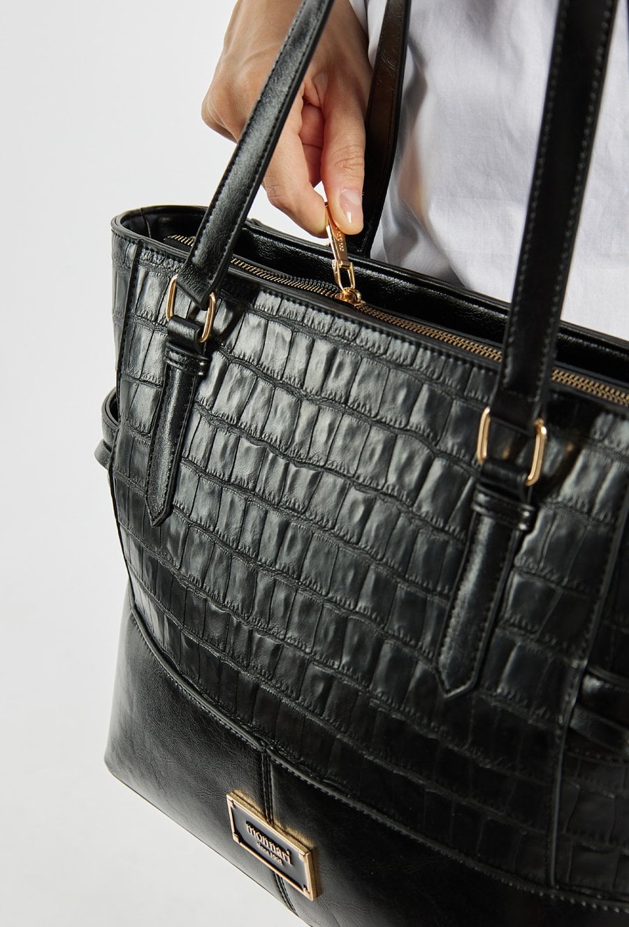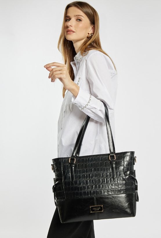 Duża torba damska o wymiarach 40 cm x 29 cm x 13 cm, idealna jako uzupełnienie biurowych stylizacji. Torba jednokomorowa o jasnej, logowanej podszewce z dodatkowymi kieszonkami na drobiazgi. Model zawieszony na wygodnych rączkach, a w zestawie znajduje się również regulowany pasek, który pozwala nosić torbę na ramieniu lub na ukos. Torbę należy przechowywać w dołączonym woreczku.