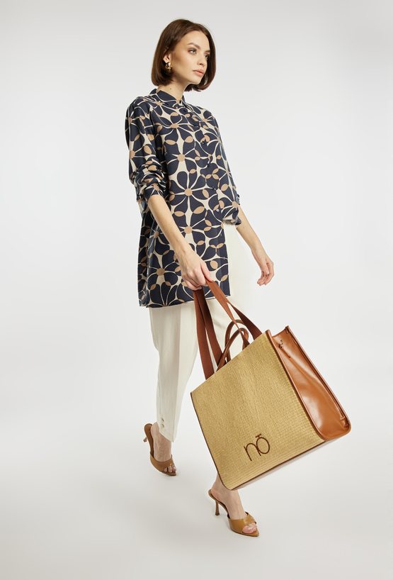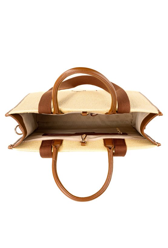 Duży koszyk damski z podwójnymi rączkami- krótszymi i dłuższymi. Jednokomorowe wnętrze wykończone jasną, logowaną podszewką. Torba idealna na wiosenne dni, a dodatkowo w zestawie znajduje się regulowany pasek do noszenia na ramieniu. Torbę należy przechowywać w dołączonym woreczku. Wymiary: 39 cm x 31,5 cm x 13 cm.