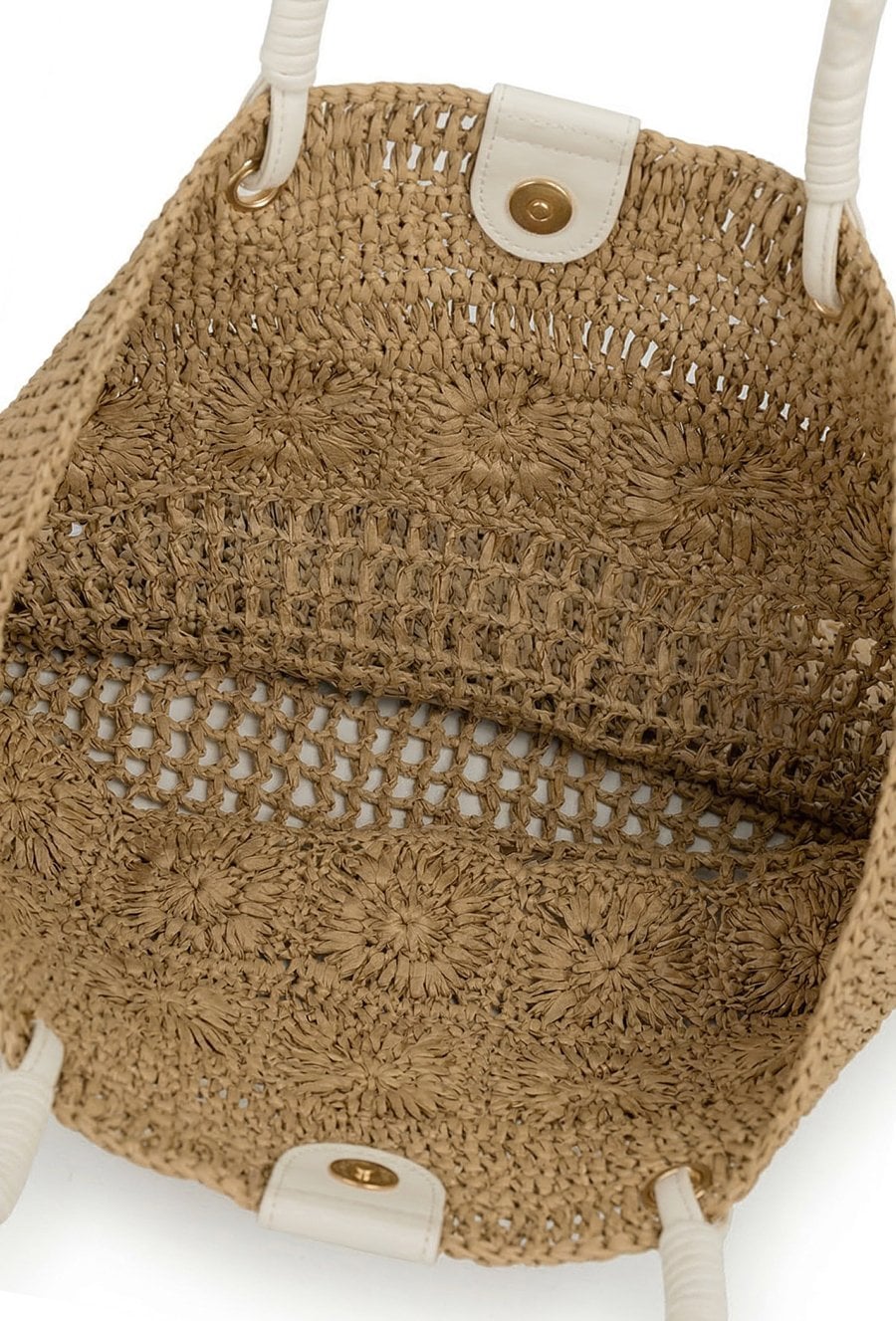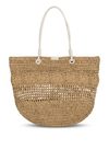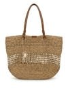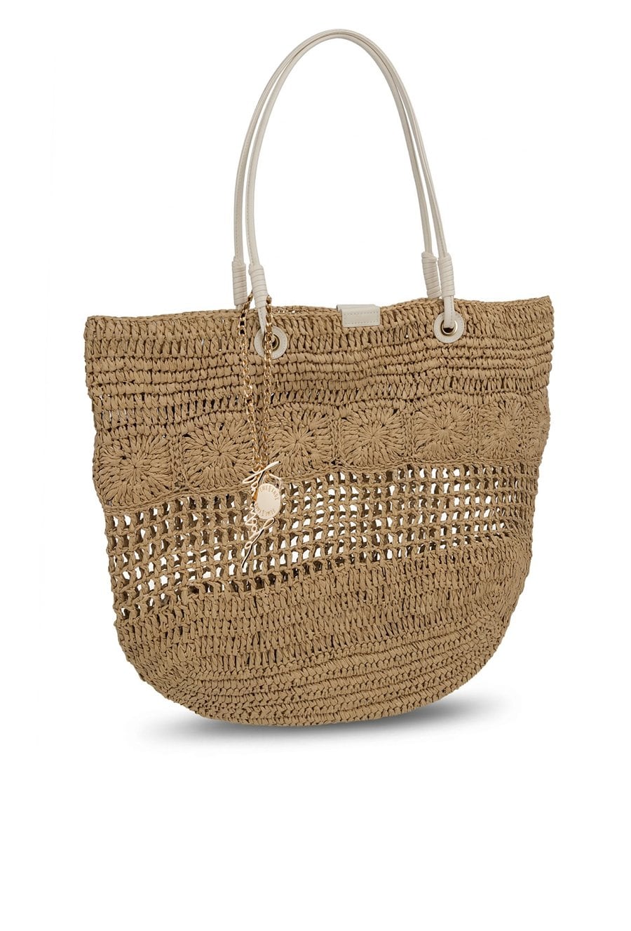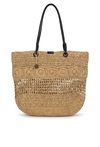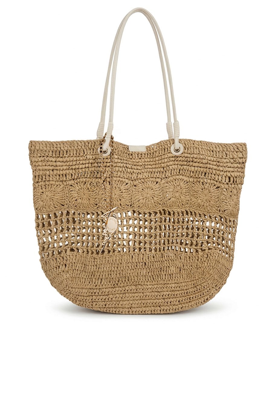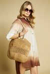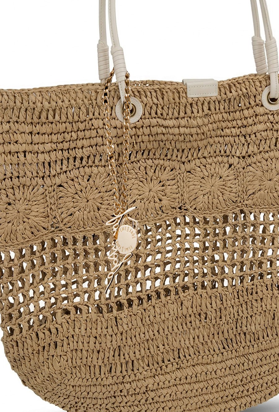 Pleciony koszyk damski, idealny do letnich stylizacji. Jednokomorowy model zapinany na napę, zawieszony na rączkach. Torebkę zdobi łańcuszek z logo marki Femestage. Torbę należy przechowywać w dołączonym woreczku. Wymiary: 45 cm x 38 cm x 11