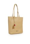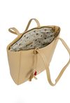Shopper damski o wymiarach 35 × 36 × 11 cm to pojemny i stylowy model na co dzień. Torba jest jednokomorowa, ma jasną, logowaną podszewkę oraz dodatkowe kieszonki na drobiazgi, które ułatwiają organizację. Torba zawieszona na rączkach wyróżnia się ozdobną przywieszką z frędzlami oraz aplikacją w kształcie ust przy jednej z nich. Torbę należy przechowywać w dołączonym woreczku.