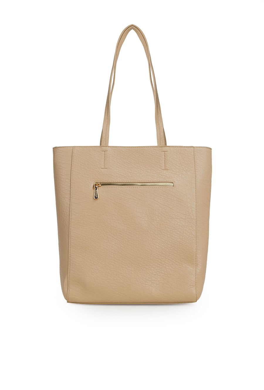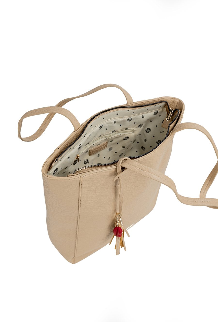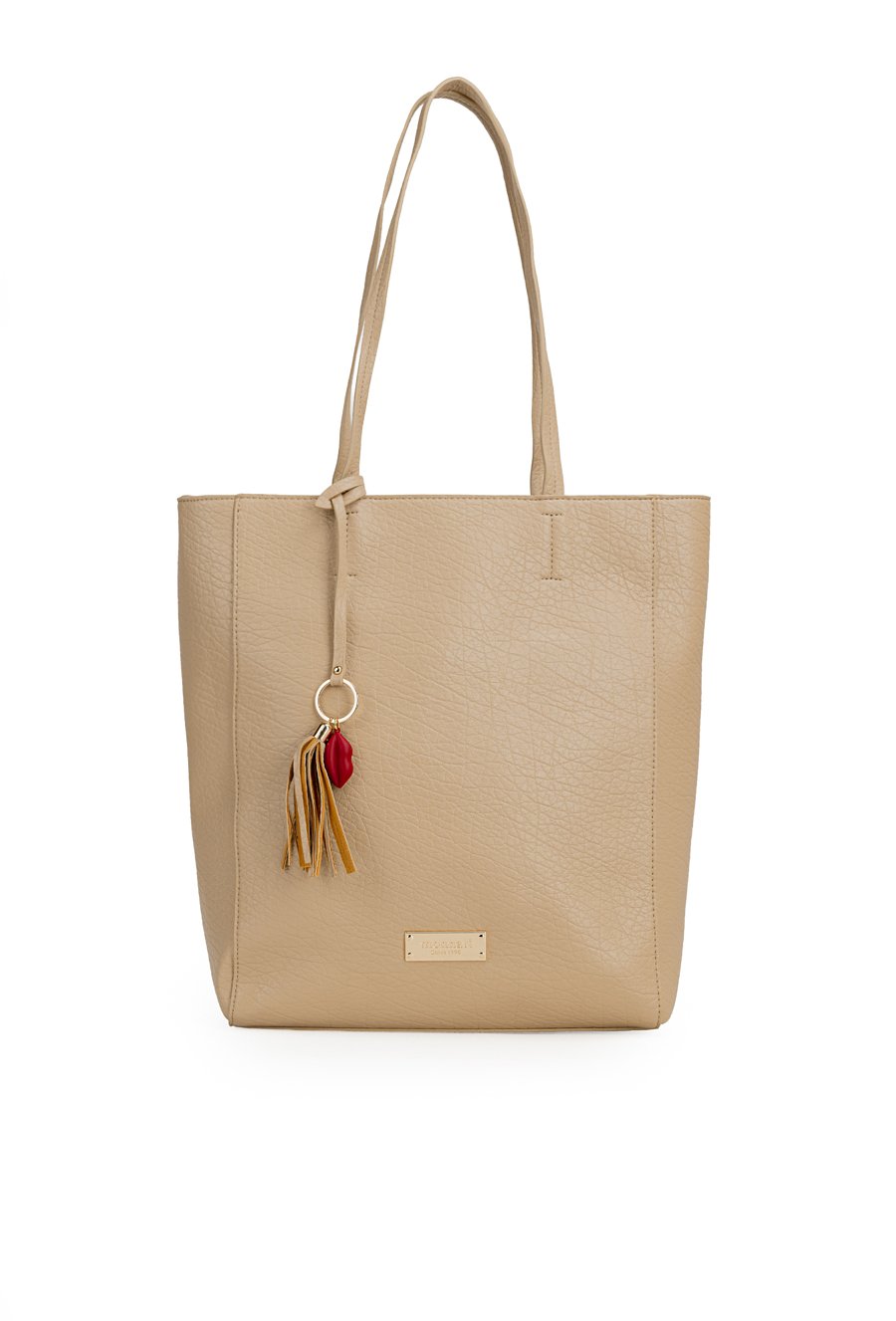 Shopper damski o wymiarach 35 × 36 × 11 cm to pojemny i stylowy model na co dzień. Torba jest jednokomorowa, ma jasną, logowaną podszewkę oraz dodatkowe kieszonki na drobiazgi, które ułatwiają organizację. Torba zawieszona na rączkach wyróżnia się ozdobną przywieszką z frędzlami oraz aplikacją w kształcie ust przy jednej z nich. Torbę należy przechowywać w dołączonym woreczku.