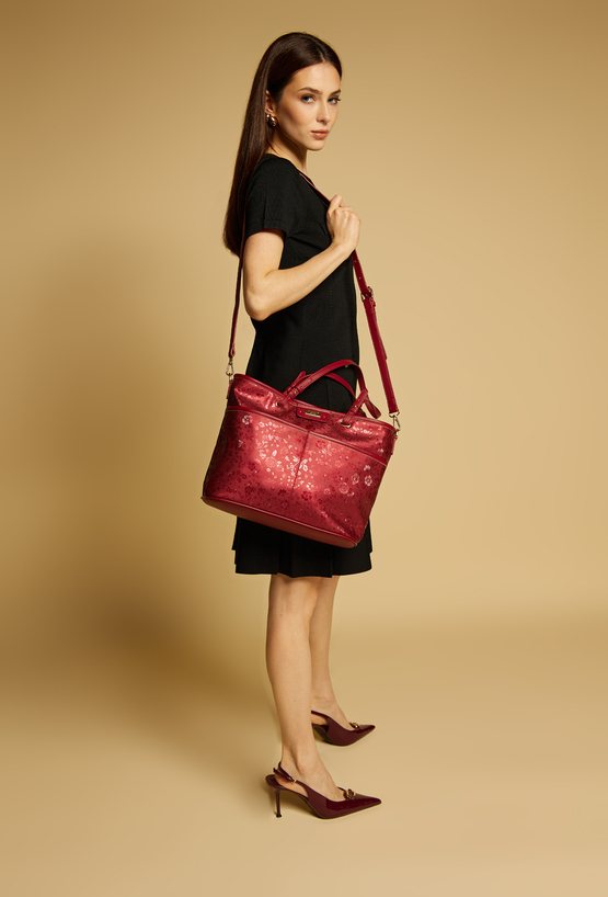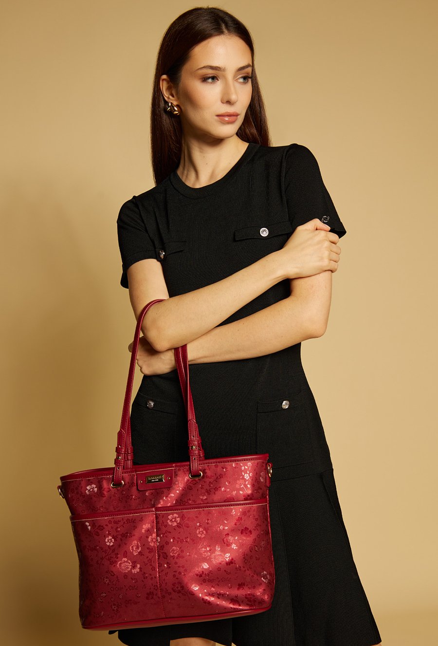 Shopper damski z kwiatowym printem, który nadaje całości subtelnego, kobiecego charakteru. Torba jednokomorowa, z jasną, logowaną podszewką oraz dodatkowymi kieszonkami na drobiazgi. Model zawieszony na regulowanych rączkach, a w zestawie znajduje się również regulowany pasek. Torbę należy przechowywać w załączonym woreczku ochronnym. Wymiary: 35cm x 26cm x 15cm