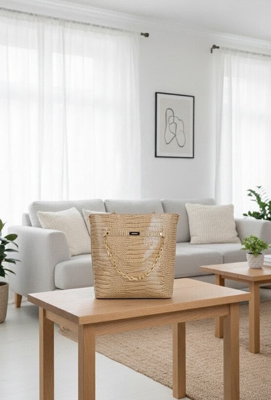 Stylowy shopper damski z ozdobnym elementem łańcuszka z przodu, który dodaje całości eleganckiego charakteru. Torba jednokomorowa, wykończona jasną, logowaną podszewką, wewnątrz wyposażona w praktyczne kieszonki na drobiazgi. Model zawieszony na wygodnych rączkach, z możliwością noszenia na ramieniu dzięki dołączonemu, regulowanemu paskowi. Wymiary torby: 40 × 33,5 × 12 cm.