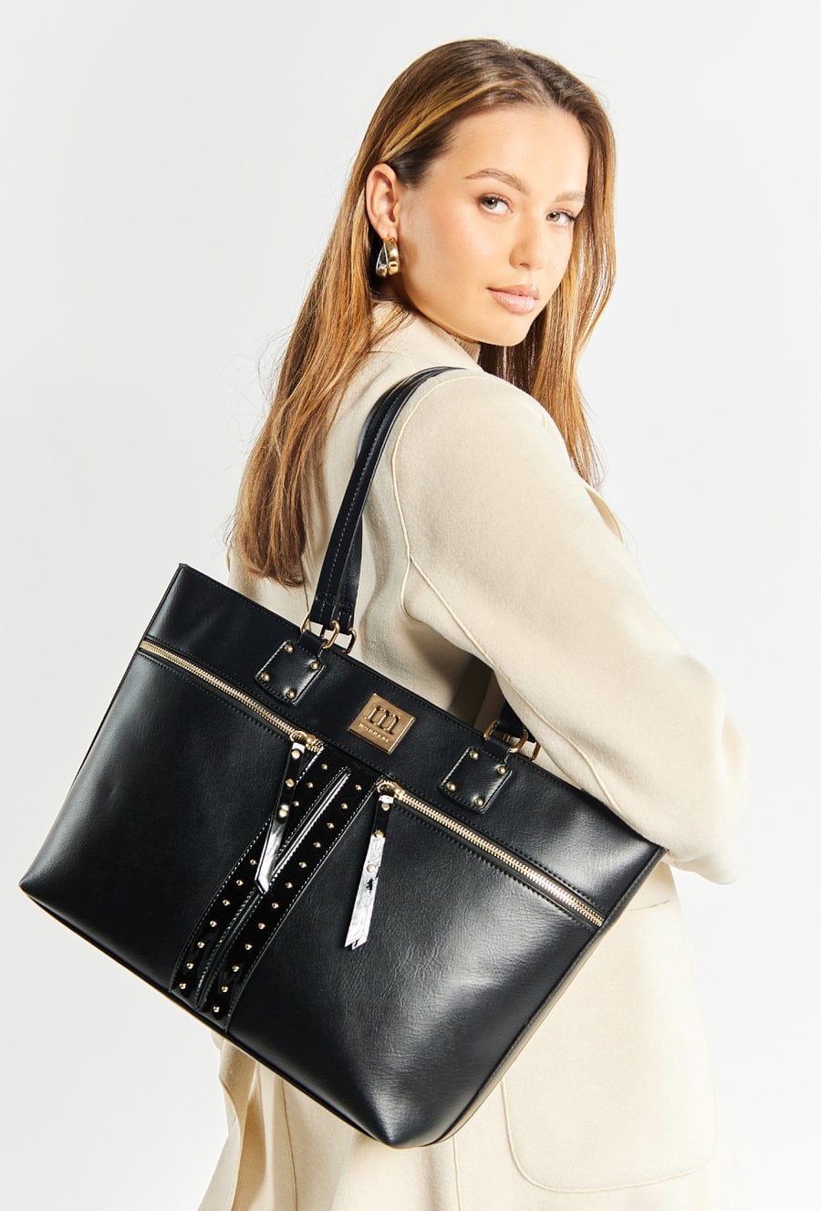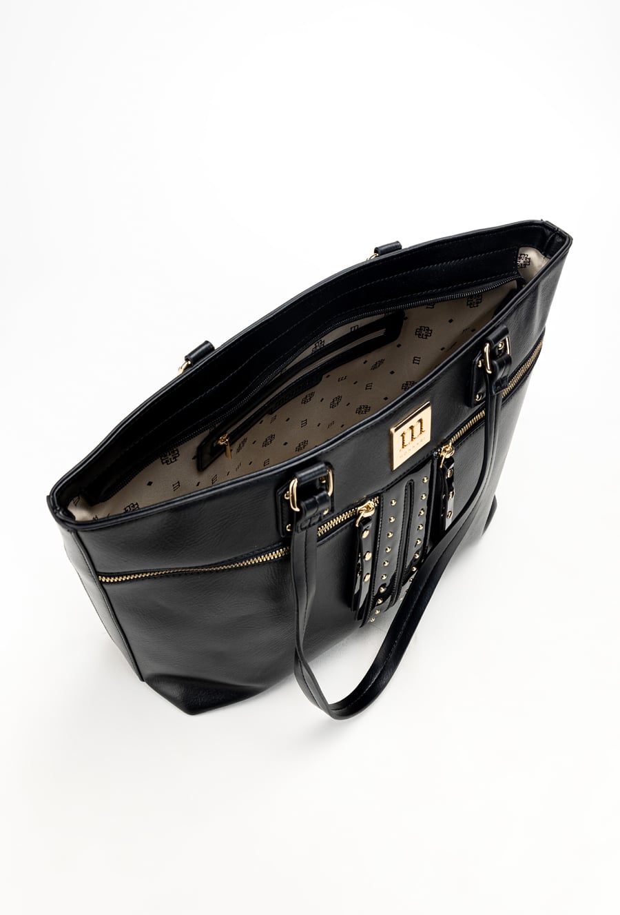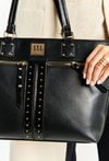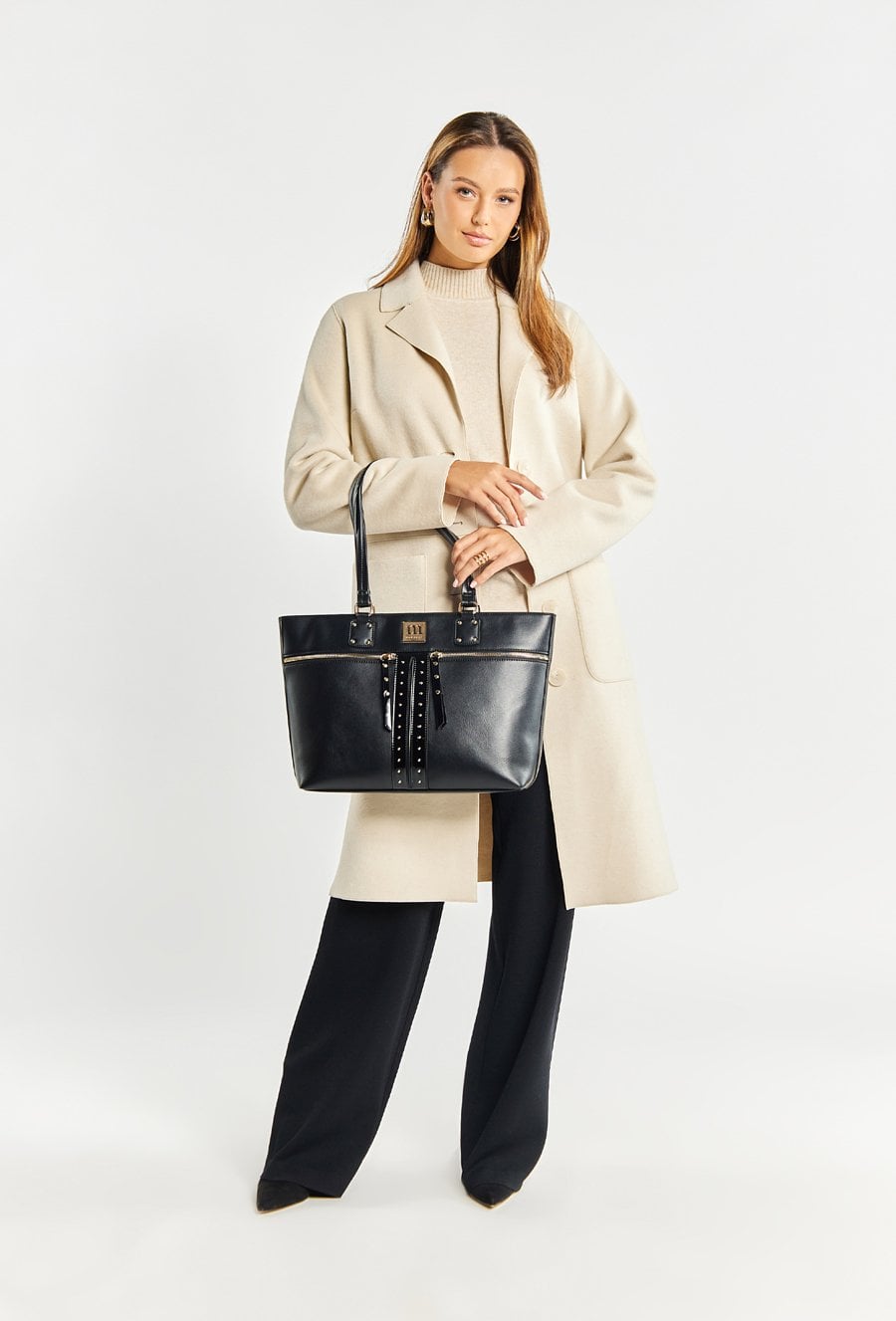Duża torba damska typi Shopper z ćwiekami na przednim panelu. Torba jednokomorowa o jasnym logowanym wnętrzu z kieszonkami na drobiazgi. Dodatkowo zarówno z przodu jak i z tyłu znajdują się kieszenie. Torba zawieszona na wygodnych rączkach. Torbę należy przechowywać w załączonym woreczku. Wymiary torby: 43 cm x 29 cm x 10 cm.