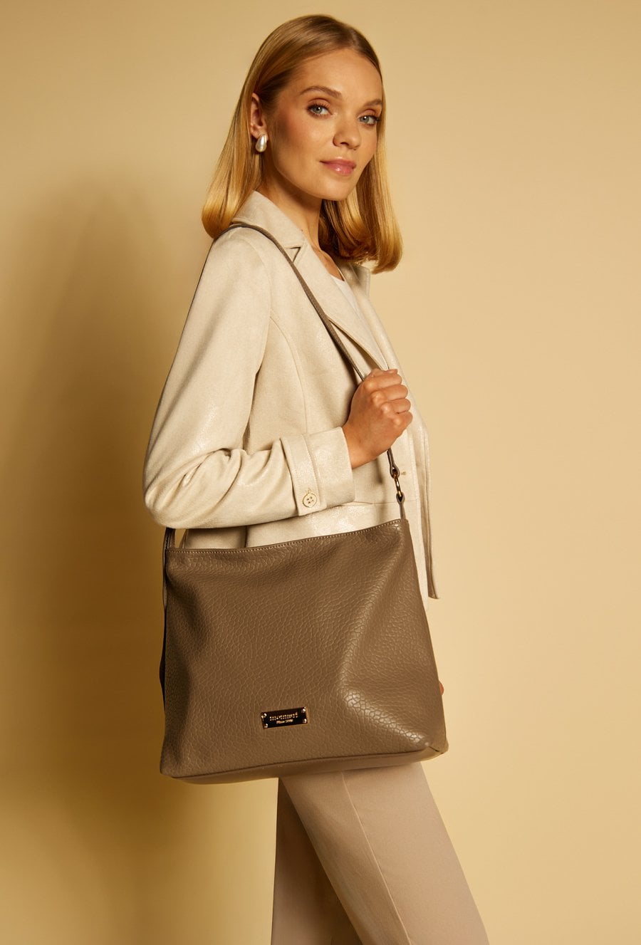 Torba damska typu shopper o wymiarach 37 cm x 30 cm x 15 cm. Torba jednokomorowa, z jasną, logowaną podszewką oraz dodatkowymi kieszonkami na drobiazgi, które ułatwiają organizację. Torba zawieszona na regulowanym pasku, wygodna i praktyczna na co dzień. Torbę należy przechowywać w załączonym woreczku.