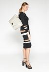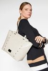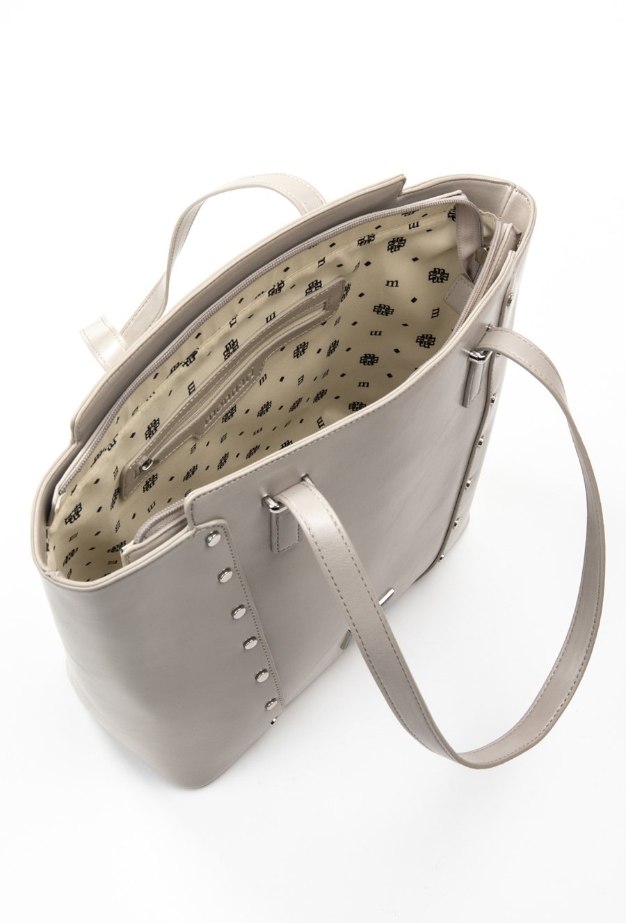 Torba damska typu shopper z ozdobną aplikacją. Torba jednokomorowa o jasnym wnętrzu z dodatkowymi kieszonkami na drobiazgi oraz kieszonką z tyłu. Torba zapinana na suwak. Torba zawieszona na rączkach. Torbę należy przechowywać w dołączonym woreczku. Wymiary Torby: 41 cm x 30,5 cm x 14,5 cm