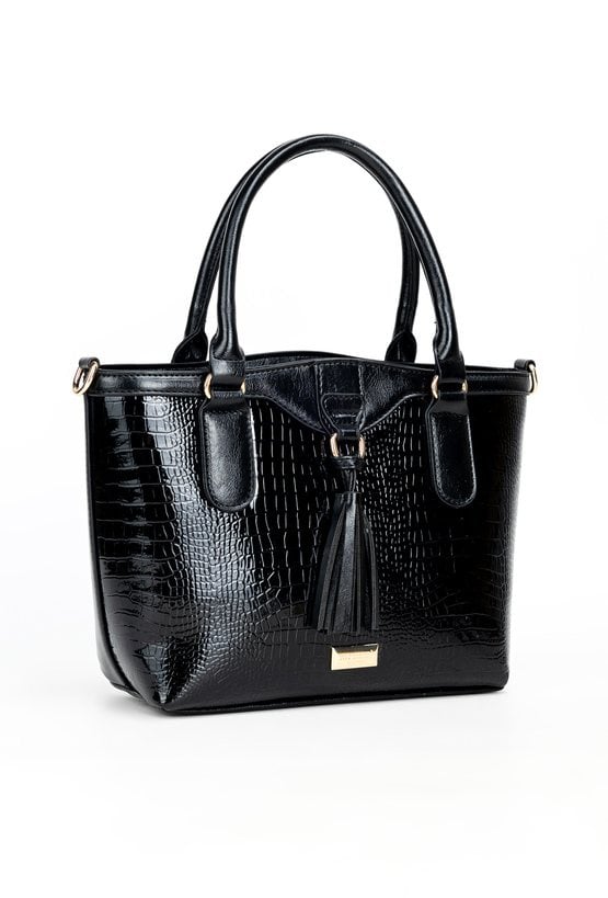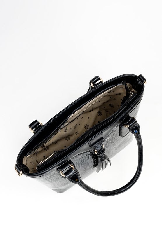 Torba damska o wymiarach: 31 cm x 21,5 cm x 10 cm, idealna na co dzień. Torba jednokomorowa o jasnej logowanej podszewce z dodatkowymi kieszonkami na drobiazgi. Zapinana od góry na suwak, zawieszona na wygodnych rączkach. W zestawie znajduje się także regulowany pasek, umożliwiający noszenie torby na ramieniu. Stylowym akcentem są dekoracyjne frędzle umieszczone z przodu. Torebkę należy przechowywać w dołączonym woreczku.