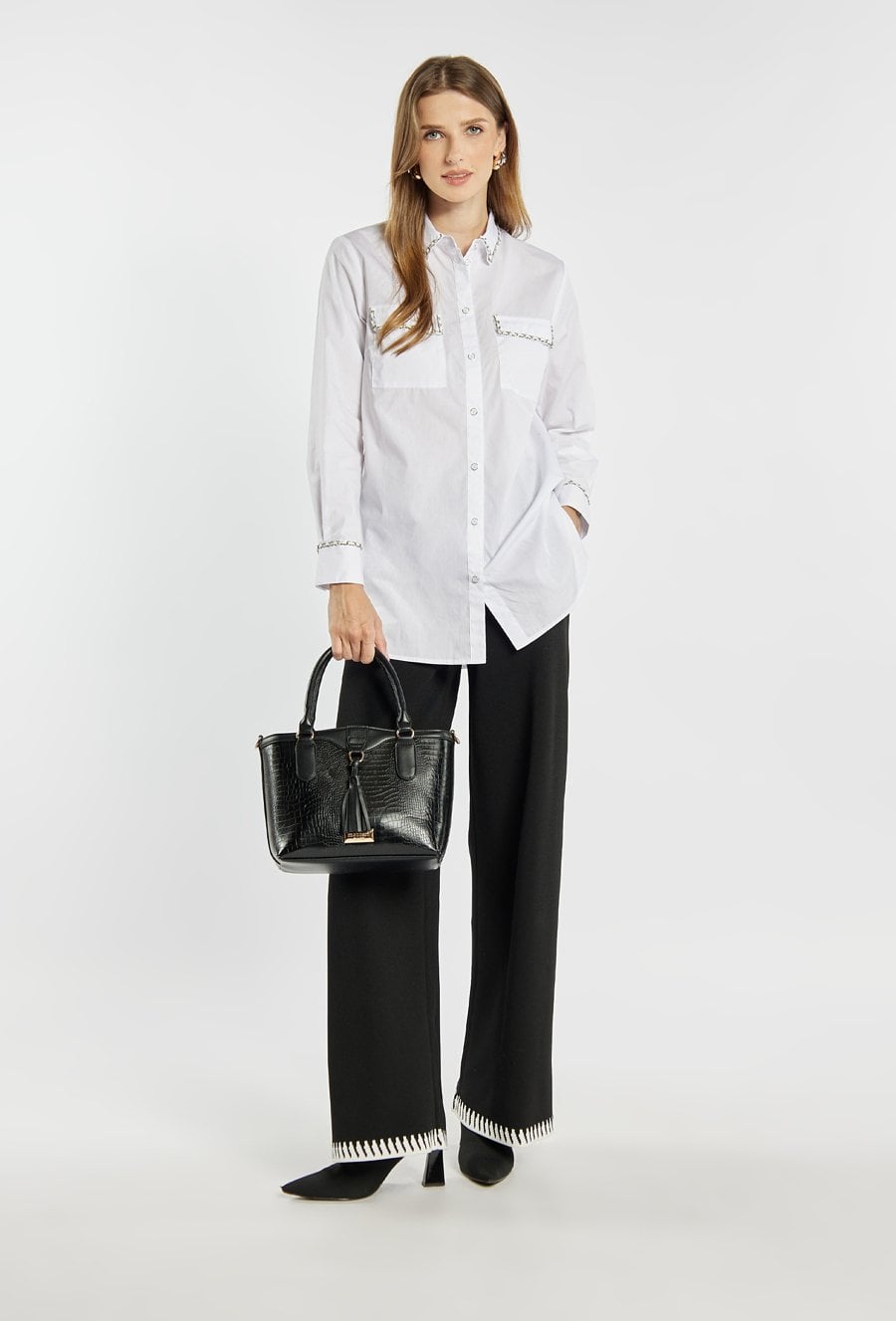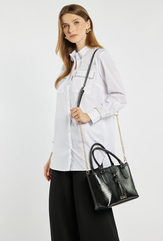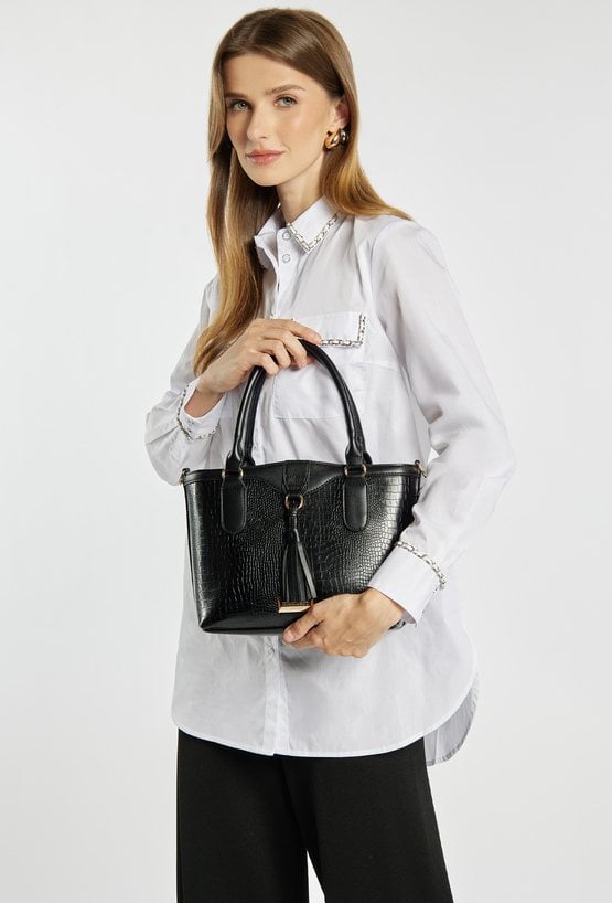 Torba damska o wymiarach: 31 cm x 21,5 cm x 10 cm, idealna na co dzień. Torba jednokomorowa o jasnej logowanej podszewce z dodatkowymi kieszonkami na drobiazgi. Zapinana od góry na suwak, zawieszona na wygodnych rączkach. W zestawie znajduje się także regulowany pasek, umożliwiający noszenie torby na ramieniu. Stylowym akcentem są dekoracyjne frędzle umieszczone z przodu. Torebkę należy przechowywać w dołączonym woreczku.