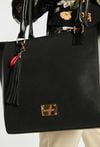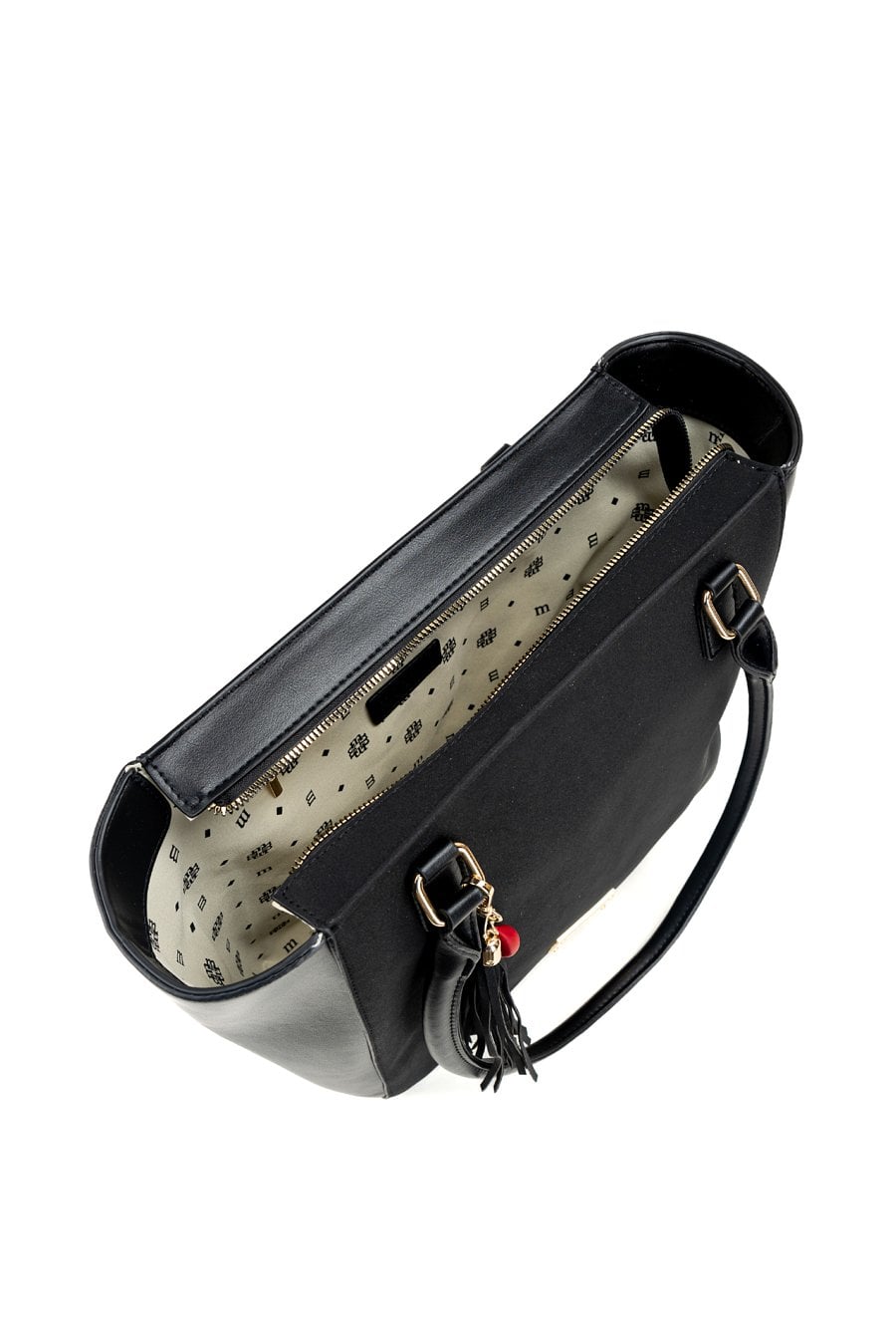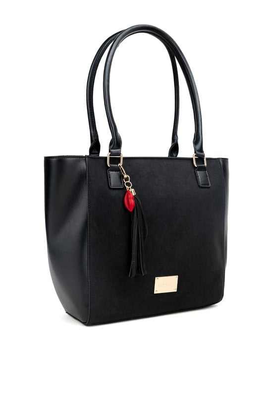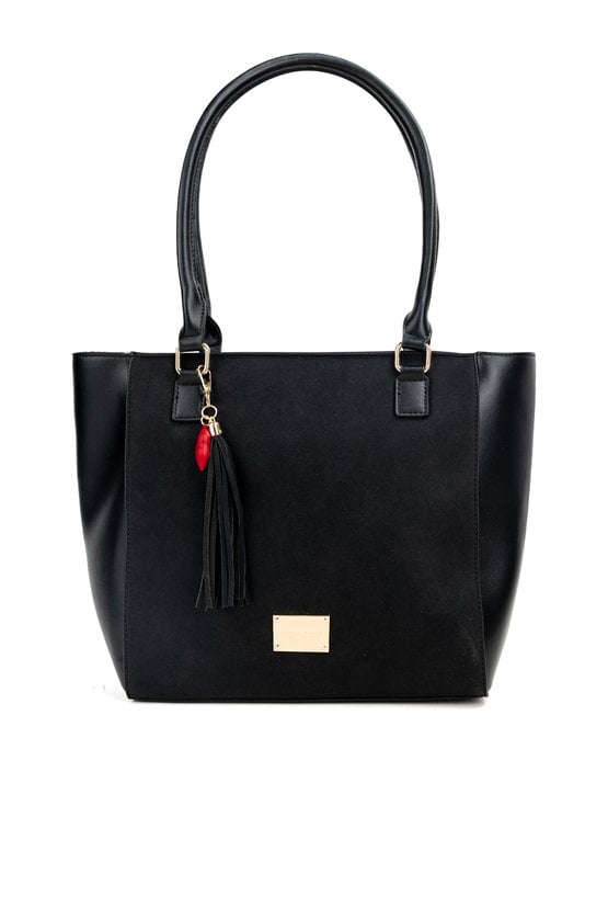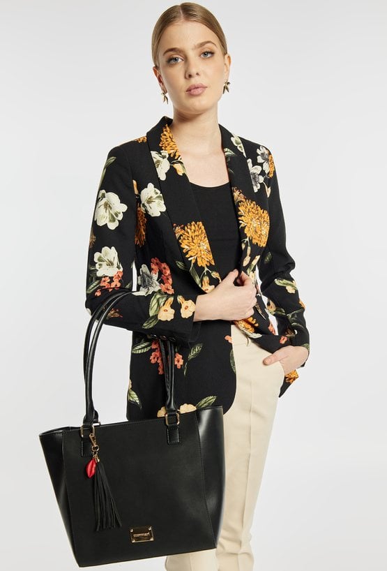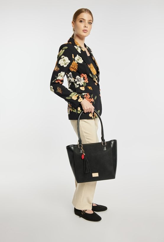 Torba damska typu shopper z kolekcji Premium. Torba jednokomorowa o jasnej, logowanej podszewce z dodatkowymi kieszonkami na drobiazgi. Torba zawieszona na rączkach. Dekoracyjnym akcentem modelu są frędzle wzbogacone czerwonym detalem. Należy przechowywać w załączonym woreczku. Wymiary: 34 cm x 28 cm x 13 cm.