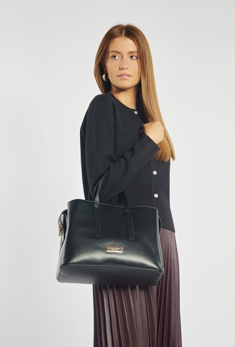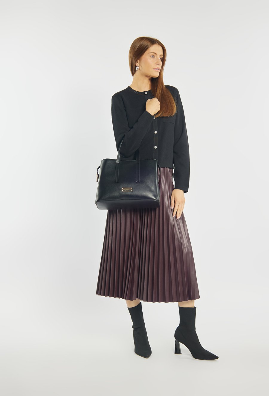 Stylowa torba damska z subtelnym wzorem. Trzykomorowe wnętrze wykończone jasną, logowaną podszewką oferuje dodatkowe kieszonki na drobiazgi, zapewniając idealny porządek. Torba zawieszona na wygodnych rączkach, w zestawie ma pasek z możliwością regulacji. Torbę należy przechowywać w dołączonym woreczku. Wymiary: 33 cm x 24,5 cm x 14 cm.