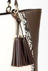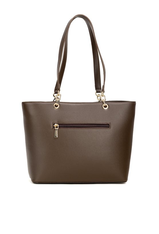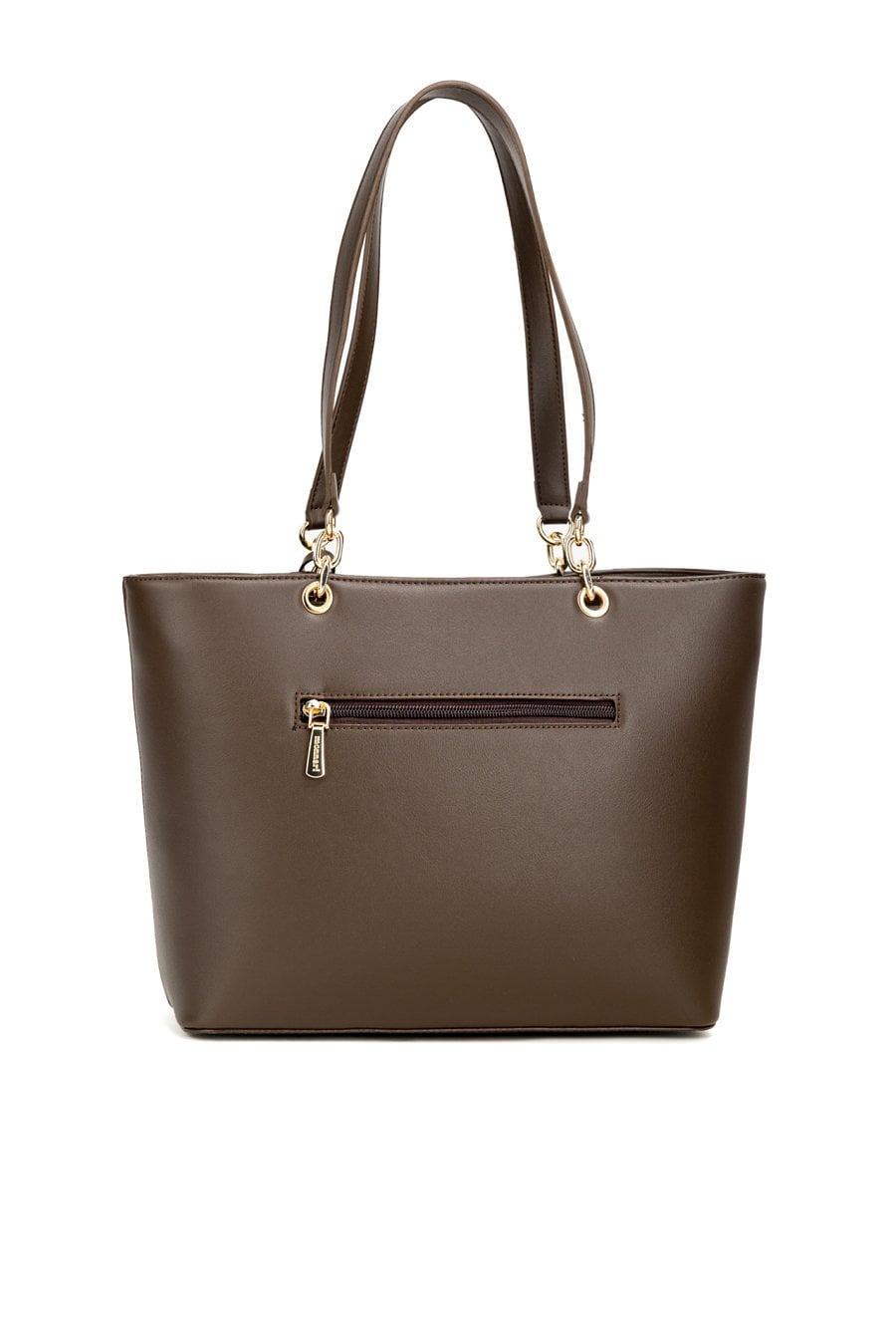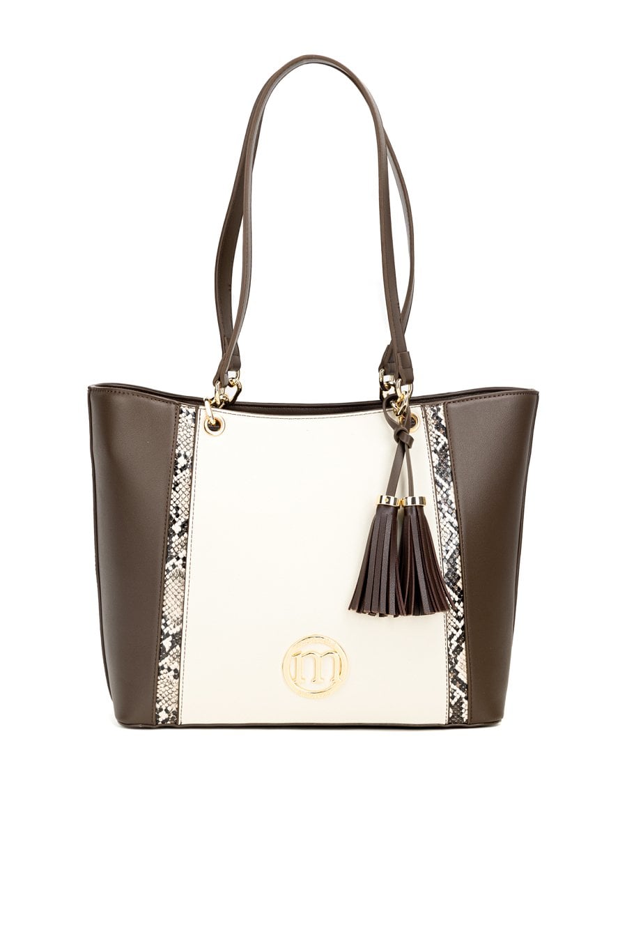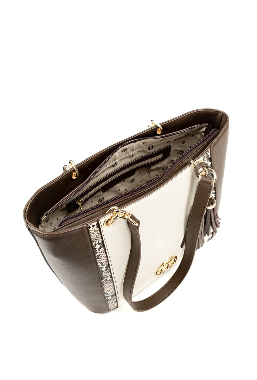 Torba damska typu shopper z przodu to efektowny dodatek, który ożywi codzienne stylizacje. Torba jest jednokomorowa, wykończona jasną, logowaną podszewką oraz dodatkowymi kieszonkami na drobiazgi. Torba została zawieszona na wygodnych rączkach, a jej charakter podkreślają modne frędzle przyczepione do rączki, dodające całości lekkości i stylu. Torbę należy przechowywać w dołączonym woreczku. Wymiary: 37 cm x 25 cm x 14 cm.