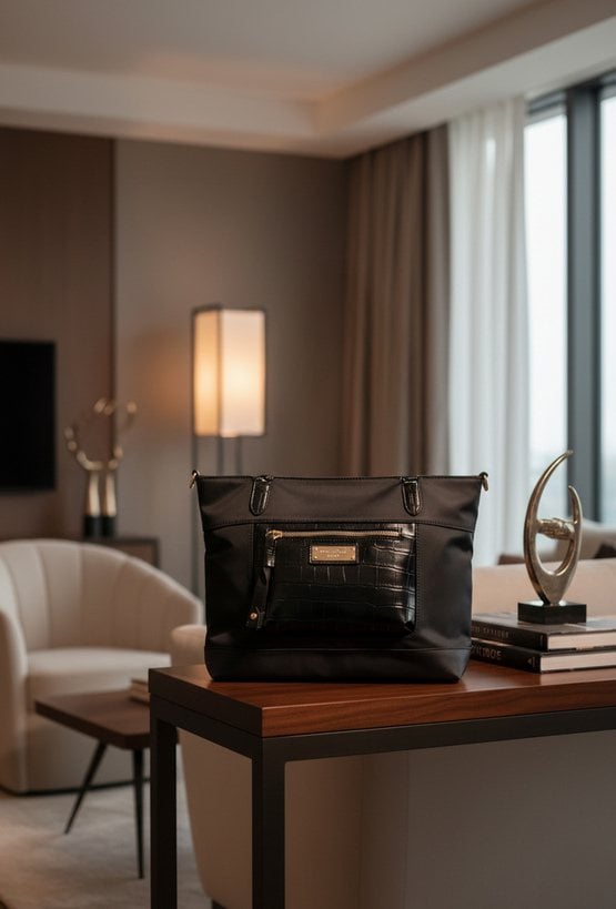 Funkcjonalna torba damska zawieszona na wygodnych rączkach, idealna na co dzień. Model jednokomorowy z jasną, logowaną podszewką został wyposażony w praktyczne kieszonki wewnętrzne, a także dodatkowe kieszenie umieszczone z przodu i z tyłu – doskonałe na drobiazgi, do których potrzebujesz szybkiego dostępu. W zestawie znajduje się regulowany pasek, który pozwala nosić torbę również na ramieniu. Torbę należy przechowywać w dołączonym woreczku. Wymiary: 38 cm x 29 cm x 12 cm.