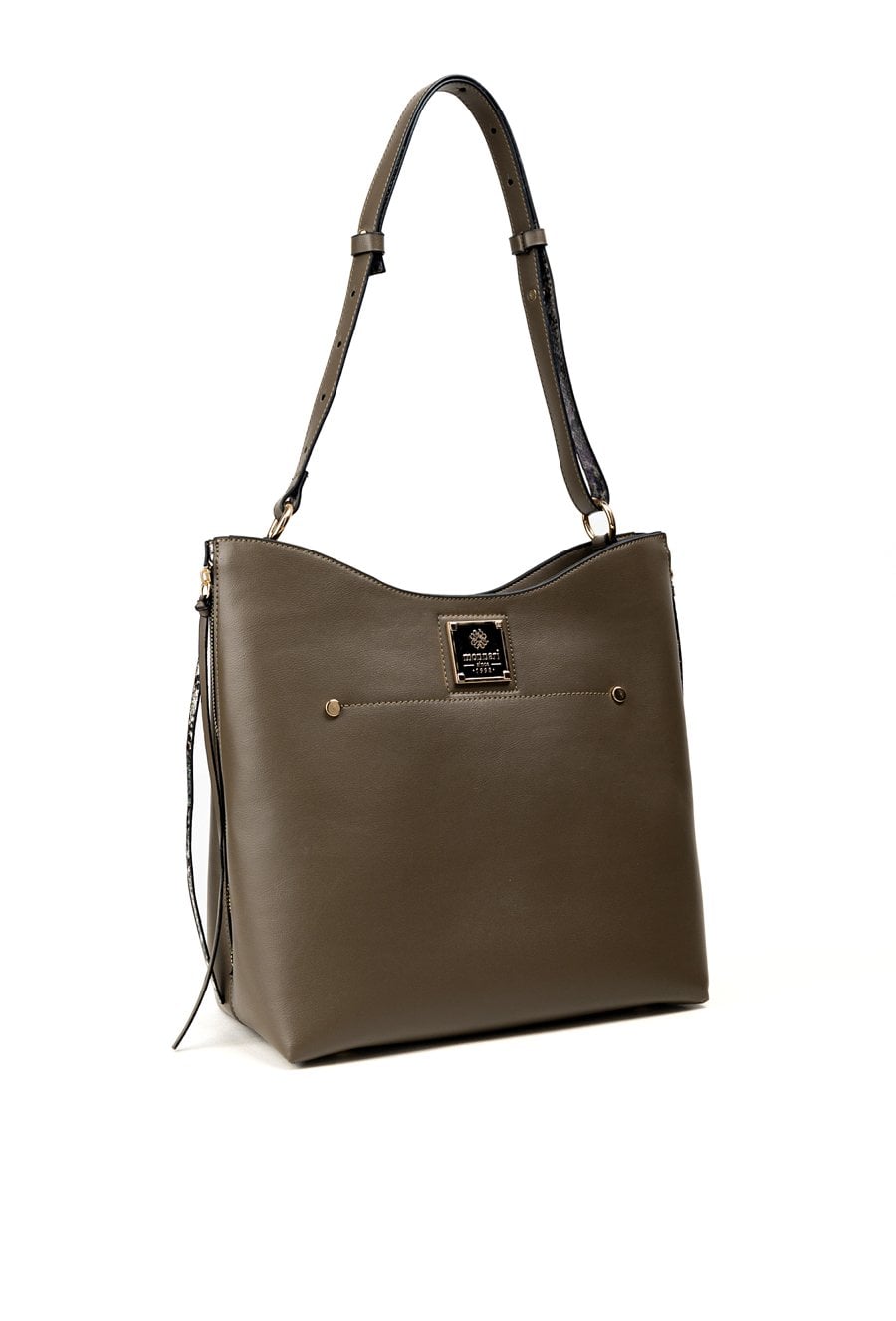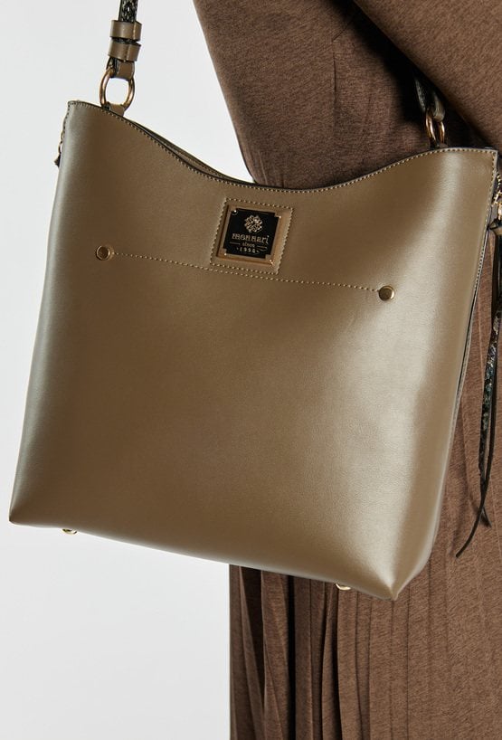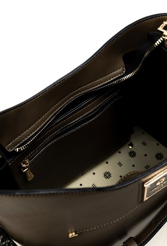 Torba damska z kolekcji Premium o wymiarach 33,5 cm x 27 cm x 9 cm. Model jednokomorowy, z jasną, logowaną podszewką oraz dodatkowymi kieszonkami na drobiazgi. Zawieszona na regulowanym pasku, zapewnia wygodę noszenia. Stylowym akcentem są dwa boczne suwaki ozdobione wzorzystymi frędzlami. Torbę należy przechowywać w załączonym woreczku ochronnym.