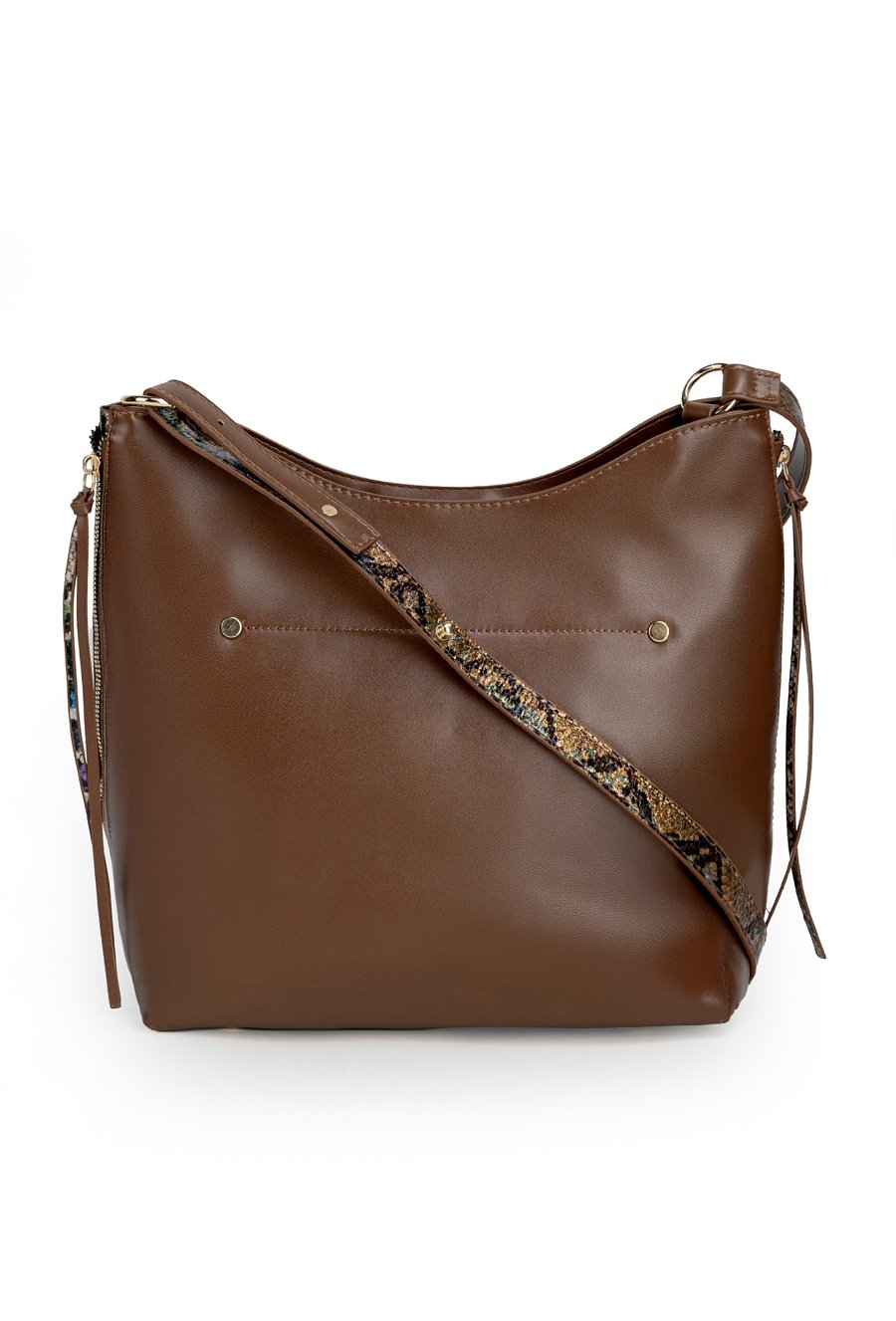 Torba damska z kolekcji Premium o wymiarach 33,5 cm x 27 cm x 9 cm. Model jednokomorowy, z jasną, logowaną podszewką oraz dodatkowymi kieszonkami na drobiazgi. Zawieszona na regulowanym pasku, zapewnia wygodę noszenia. Stylowym akcentem są dwa boczne suwaki ozdobione wzorzystymi frędzlami. Torbę należy przechowywać w załączonym woreczku ochronnym.