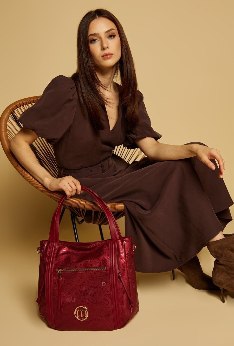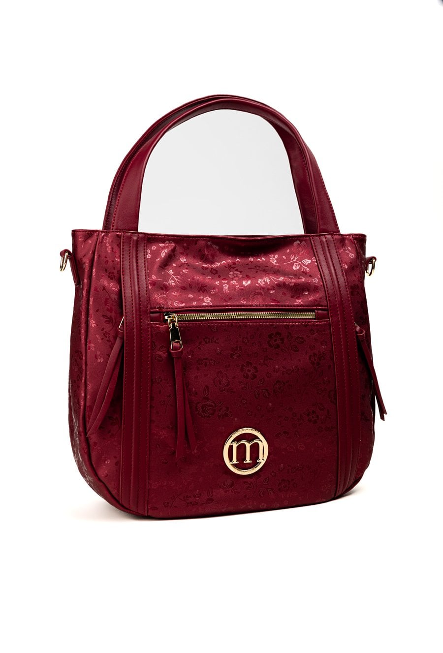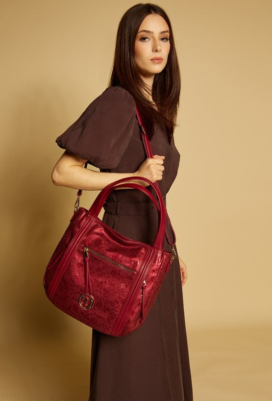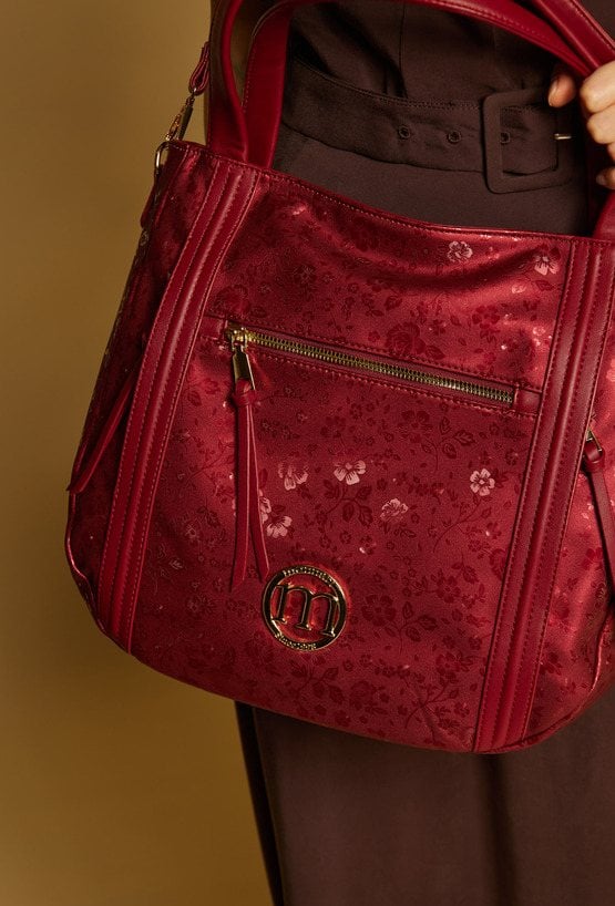 Torba damska z kwiatowym motywem, łącząca elegancję z kobiecym urokiem. Model jednokomorowy, z jasną, logowaną podszewką oraz dodatkowymi kieszonkami – zarówno wewnątrz, jak i na zewnątrz. Torba zawieszona na rączkach, a w zestawie znajduje się pasek z możliwością regulacji. Torbę należy przechowywać w załączonym woreczku ochronnym. Wymiary: 35 cm x 32 cm x 10 cm