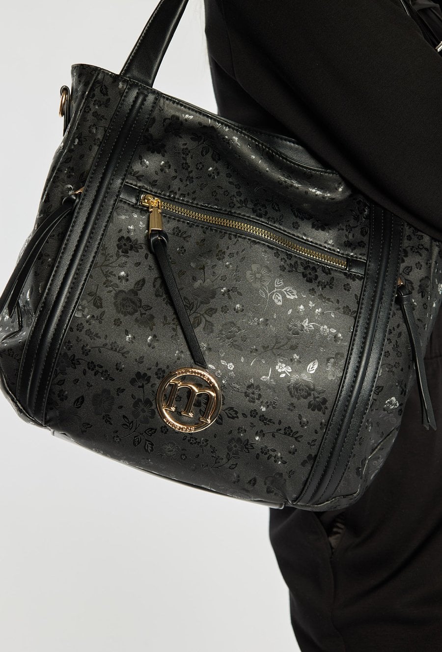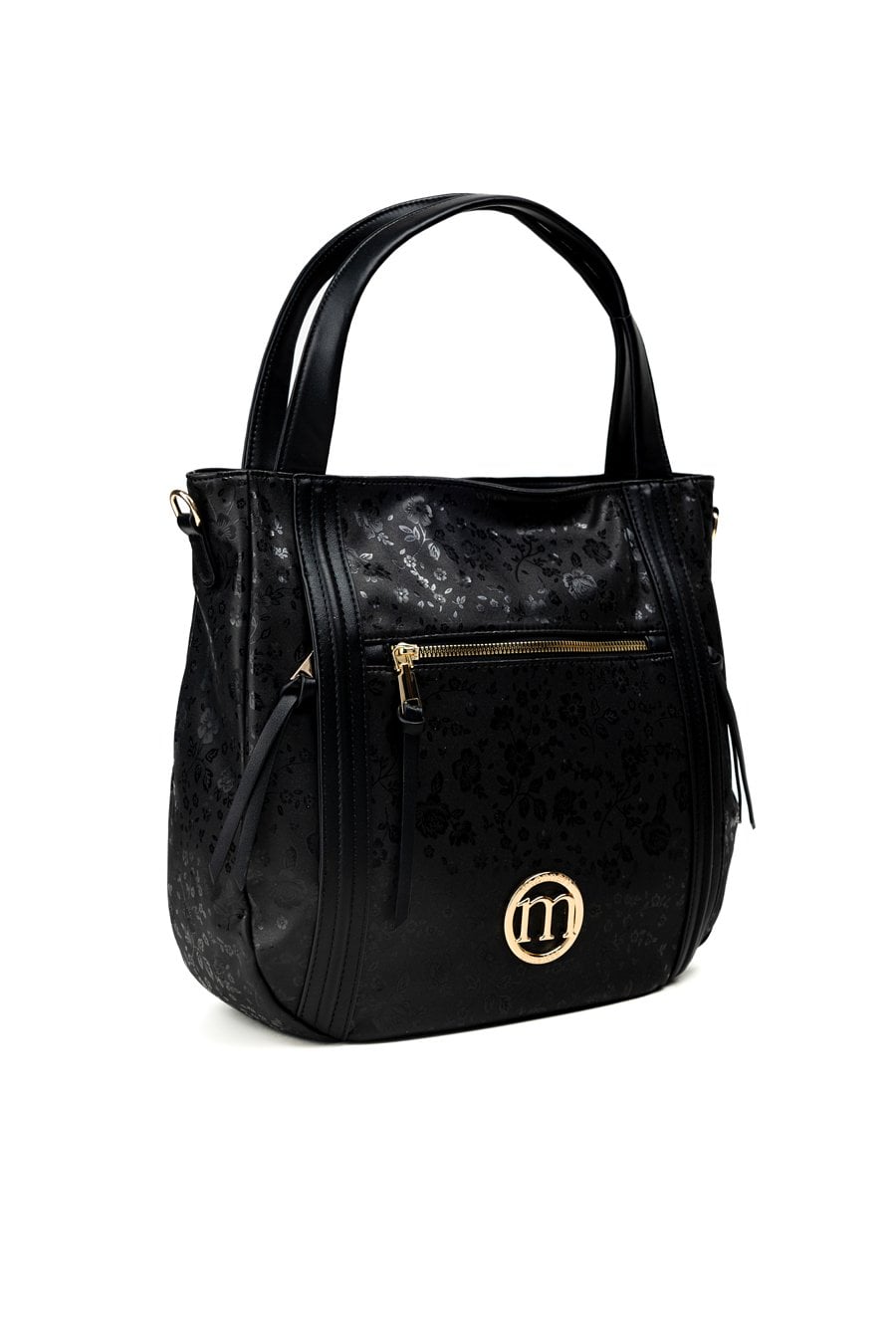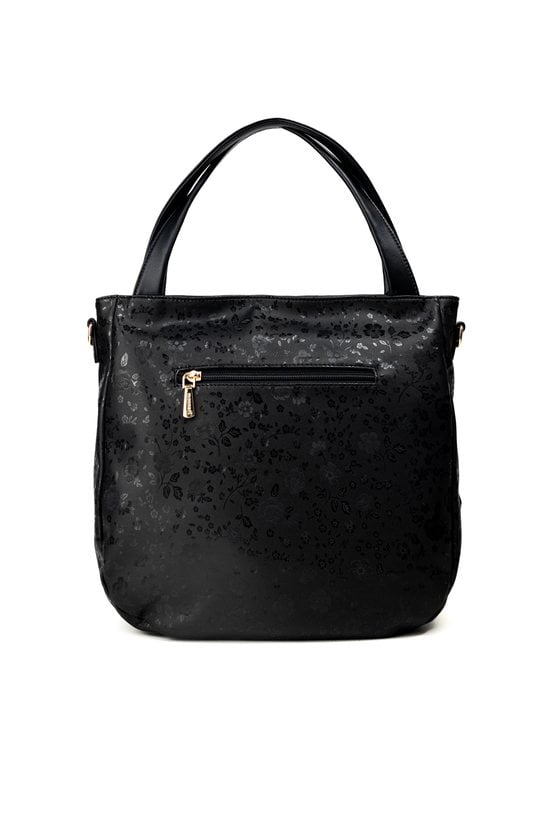 Torba damska z kwiatowym motywem, łącząca elegancję z kobiecym urokiem. Model jednokomorowy, z jasną, logowaną podszewką oraz dodatkowymi kieszonkami – zarówno wewnątrz, jak i na zewnątrz. Torba zawieszona na rączkach, a w zestawie znajduje się pasek z możliwością regulacji. Torbę należy przechowywać w załączonym woreczku ochronnym. Wymiary: 35 cm x 32 cm x 10 cm