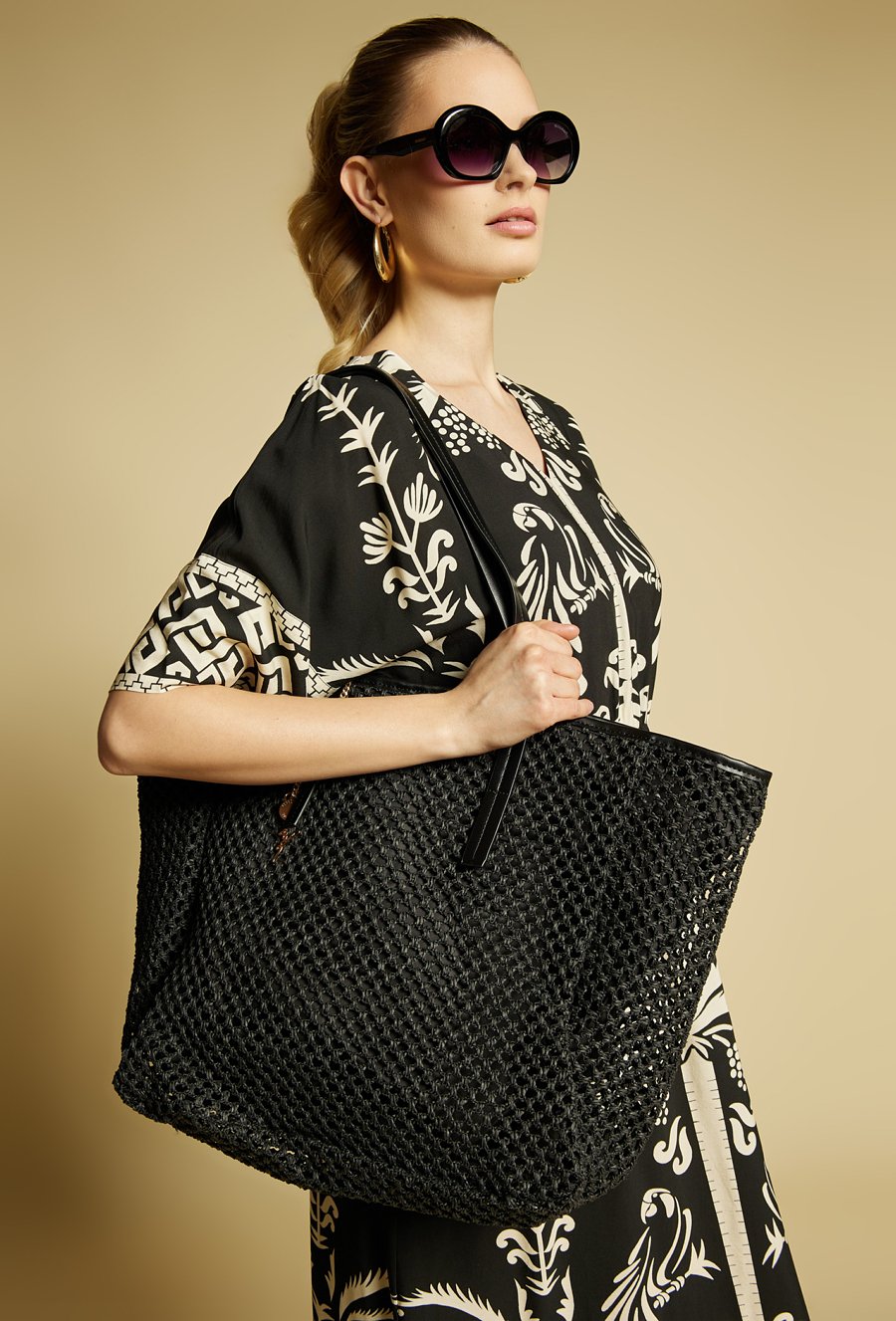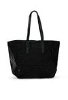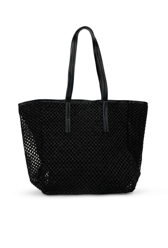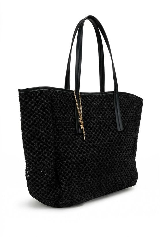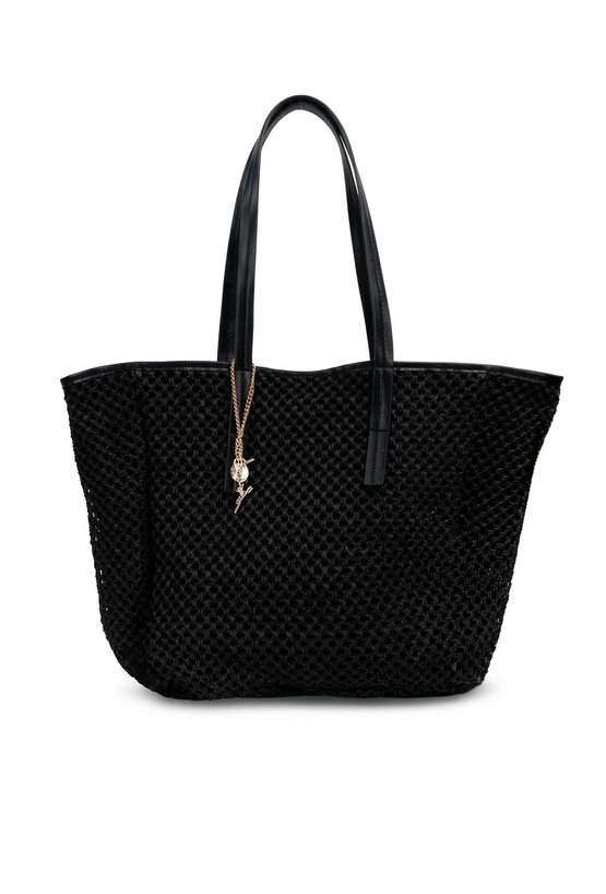 Torba damska o wymiarach 51 × 37 × 18 cm z ozdobną plecionką. Jednokomorowy model z jasną podszewką oraz dodatkowymi kieszonkami na drobiazgi. Torba zapinana na napę, zawieszona na rączkach. Torbę należy przechowywać w dołączonym woreczku.