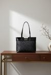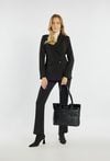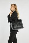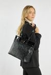 Shopper damski z efektownym zdobieniem na przednim panelu. Jednokomorowy model z jasną, logowaną podszewką oraz praktycznymi kieszonkami na drobiazgi. Torba zawieszona na rączkach, zapinana od góry na suwak – idealna na co dzień. Torbę należy przechowywać w dołączonym woreczku. Wymiary: 40 cm x 28 cm x 14 cm.