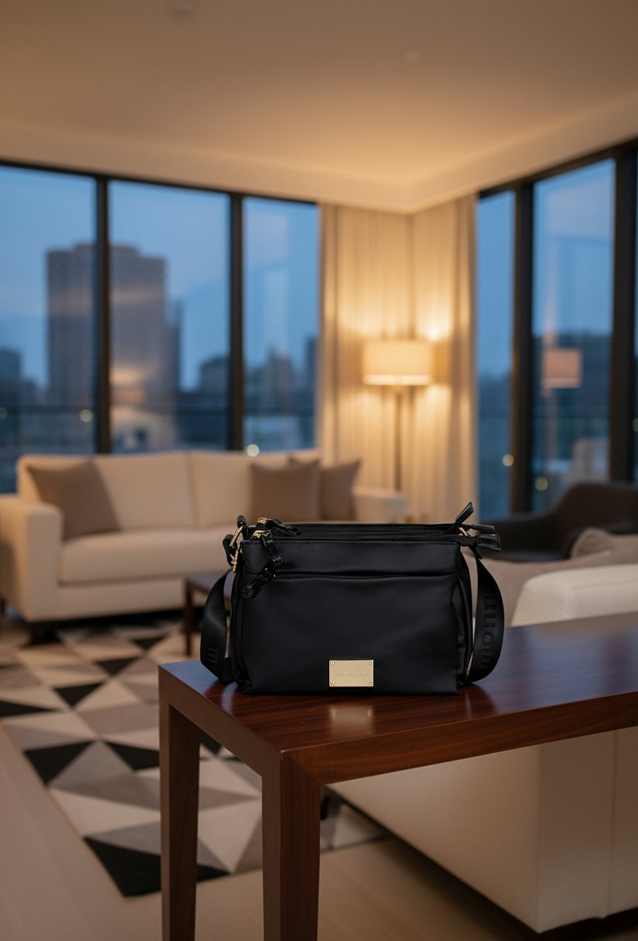 Trzykomorowa torebka damska o wymiarach 27 cm x 19 cm x 13 cm, idealna dla kobiet ceniących porządek i funkcjonalność. Jasne, logowane podszewki kryją praktyczne kieszonki na drobiazgi, a podział na trzy niezależne komory ułatwia organizację codziennych niezbędników. Model zawieszony na regulowanym pasku. Torbę należy przechowywać w dołączonym woreczku.