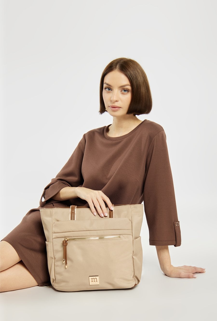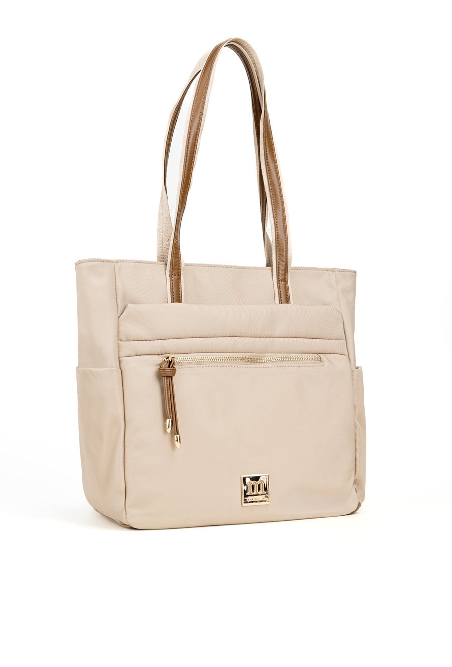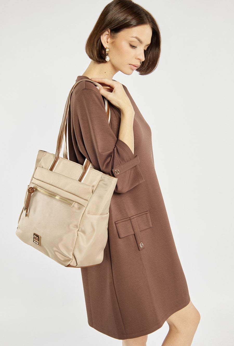 Duża torba damska o wymiarach 37 cm x 33 cm x 14 cm. Model jednokomorowy, z jasną, logowaną podszewką, zawieszony na rączkach. Z przodu znajdują się dwie praktyczne kieszonki, a po bokach dodatkowe kieszenie idealne na napój lub drobiazgi, co czyni torbę wyjątkowo funkcjonalną na co dzień. Torebkę należy przechowywać w dołączonym woreczku.