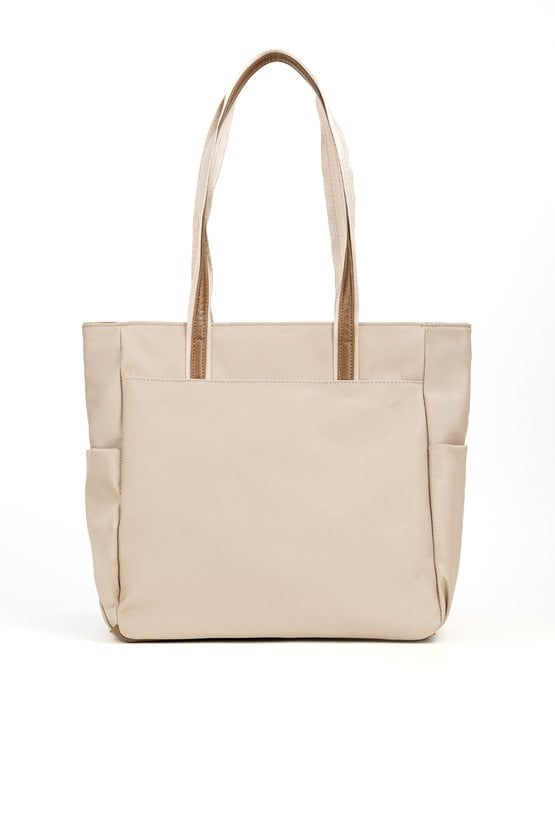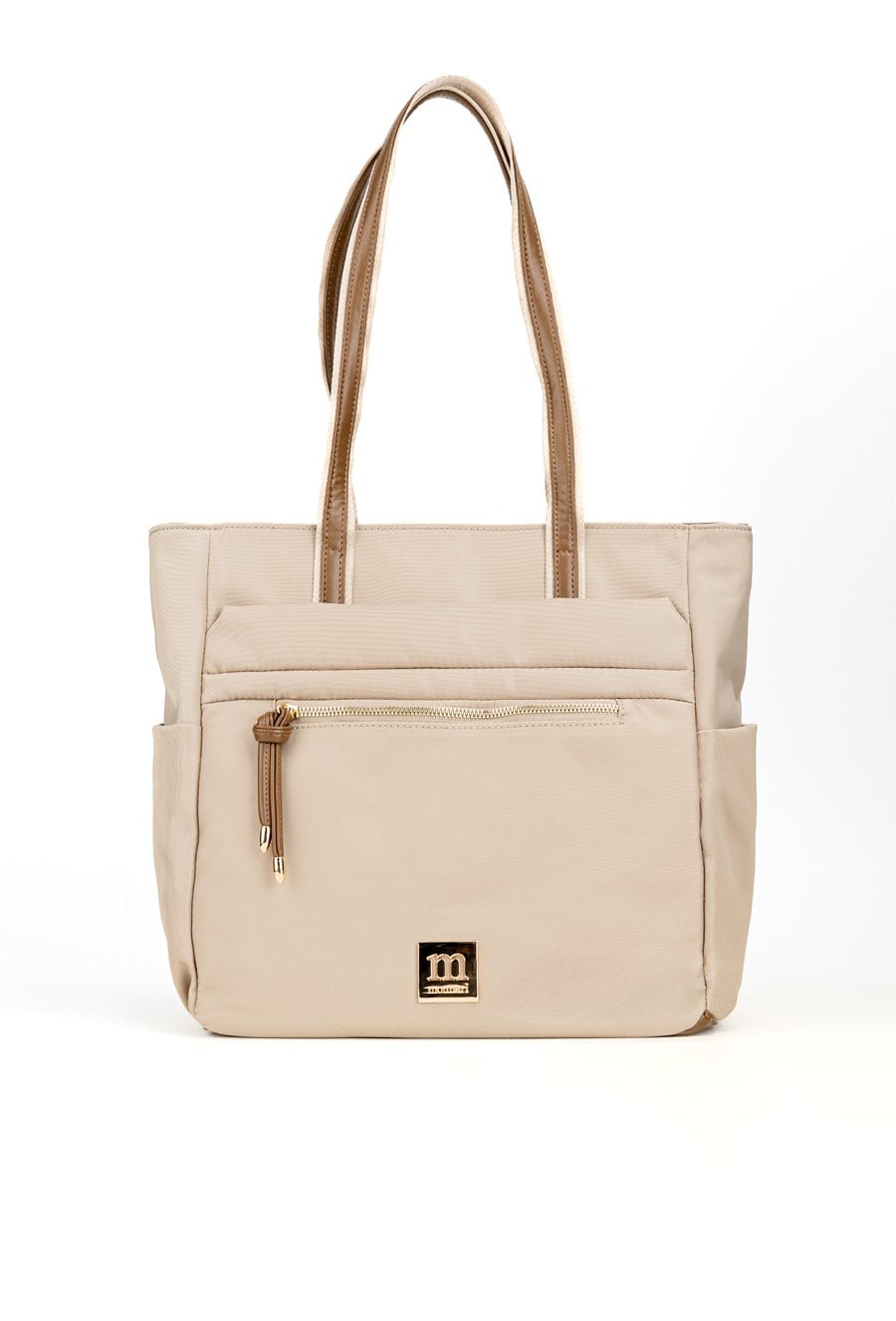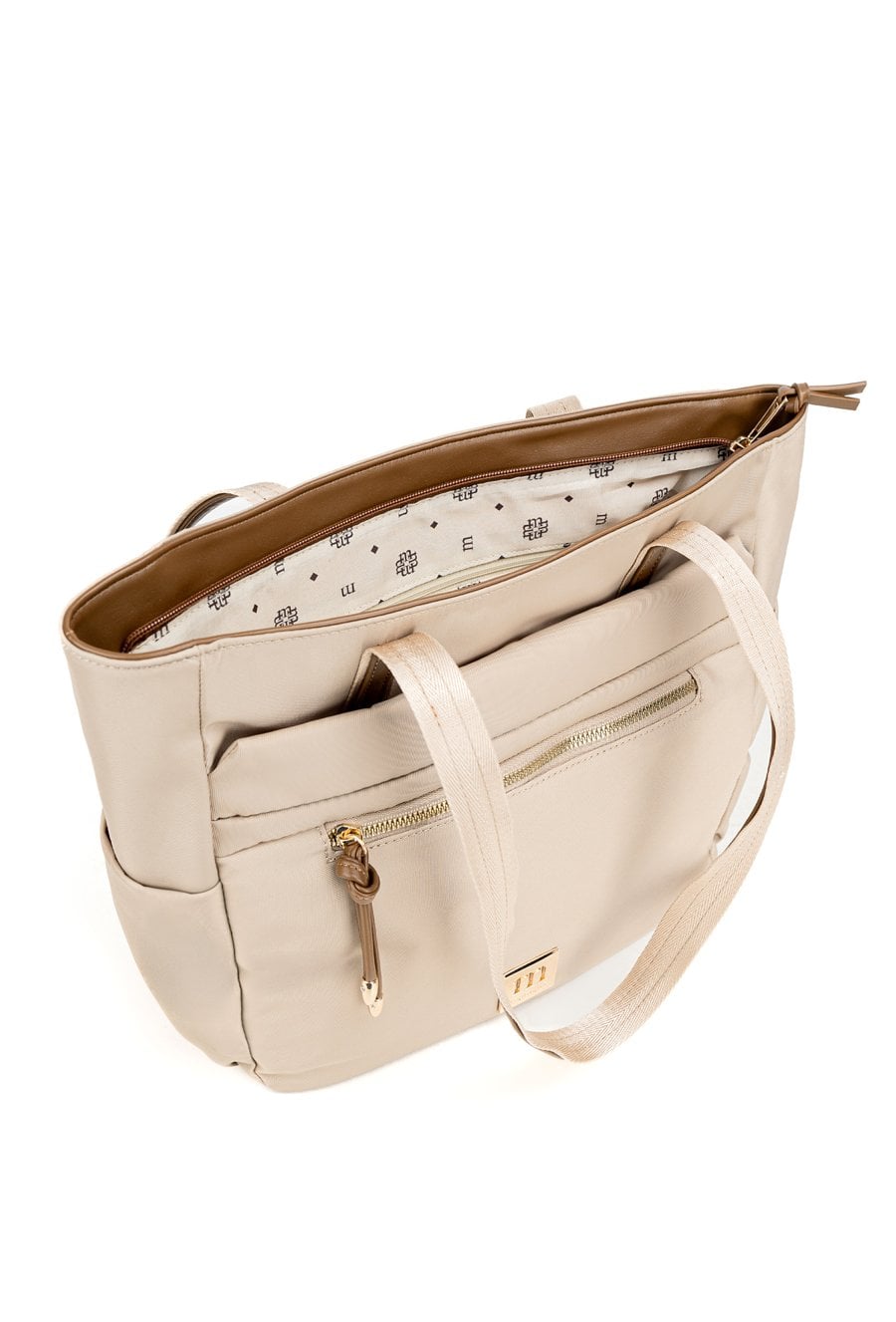 Duża torba damska o wymiarach 37 cm x 33 cm x 14 cm. Model jednokomorowy, z jasną, logowaną podszewką, zawieszony na rączkach. Z przodu znajdują się dwie praktyczne kieszonki, a po bokach dodatkowe kieszenie idealne na napój lub drobiazgi, co czyni torbę wyjątkowo funkcjonalną na co dzień. Torebkę należy przechowywać w dołączonym woreczku.